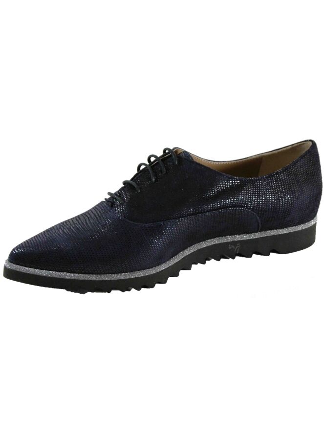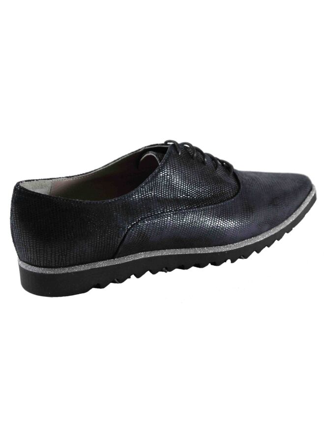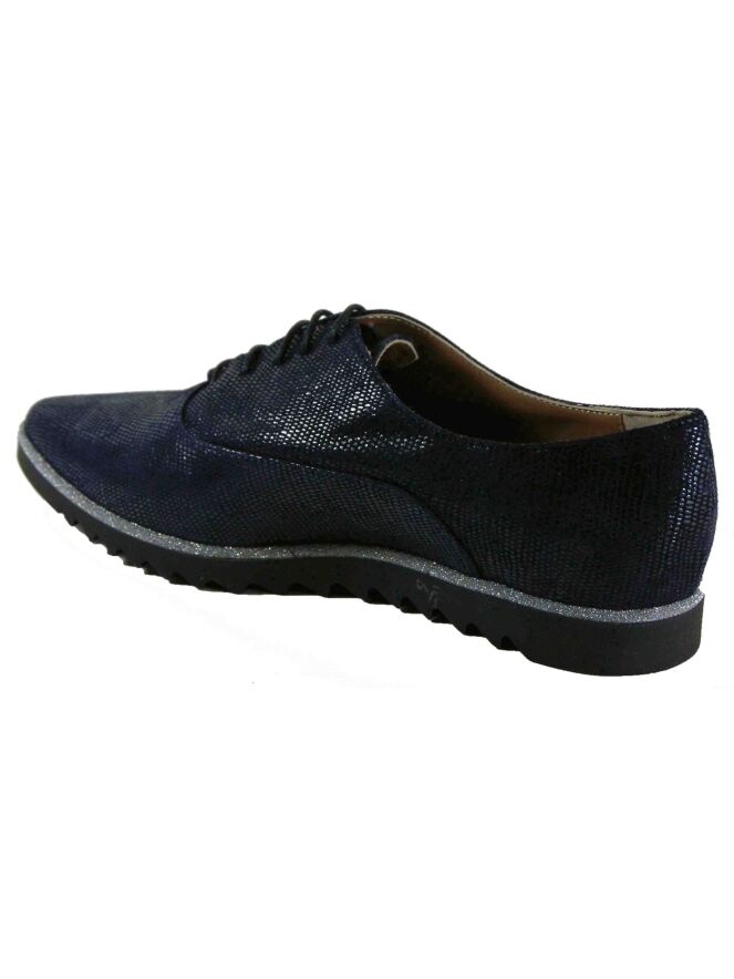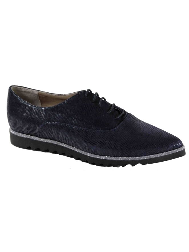 A lace-up shoe by the brand Evaluna in the color navy bleu in a fine reptile print. The shoe has a sporty jagged sole with a band at the attachment of the shoe in a metallic silver color. This lace-up shoe is leather lined on the inside.