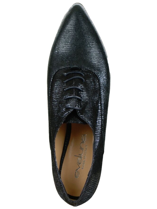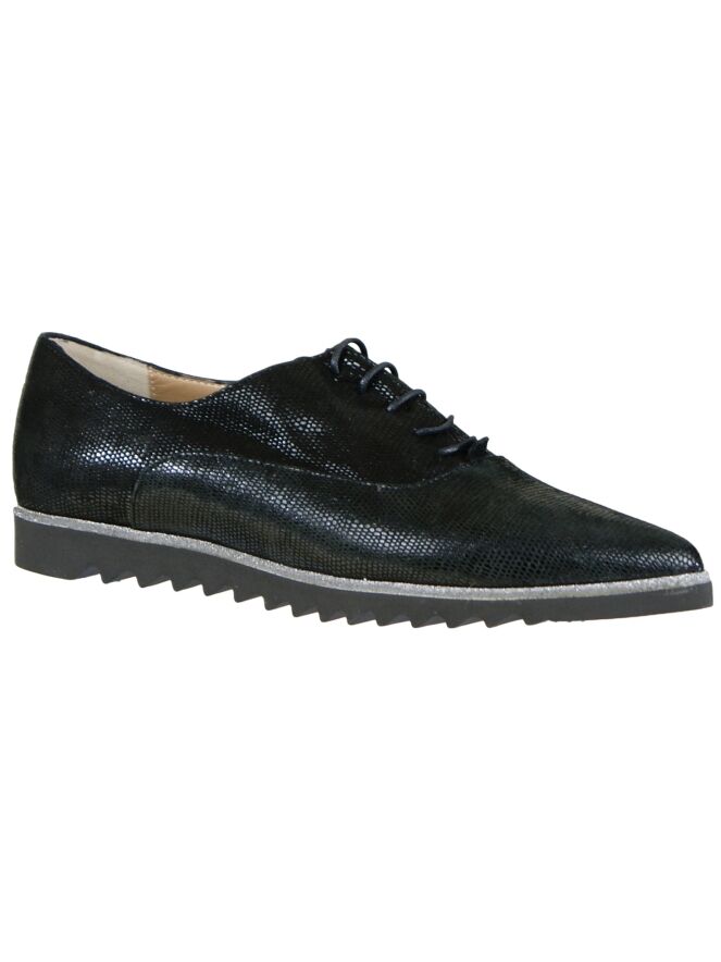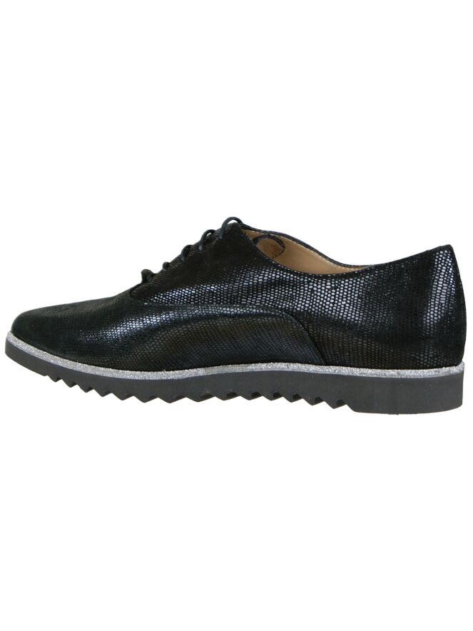 A lace-up shoes by the brand Evaluna in a color black in a fine reptile print. The shoe has a sporty jagged sole with a band at the attachment of the shoe in a metallic silver color. This lace-up shoe is leather lined on the inside.