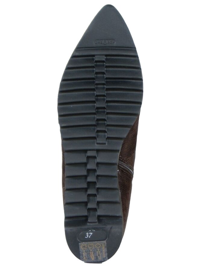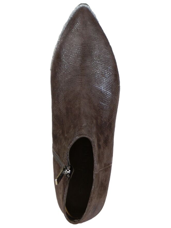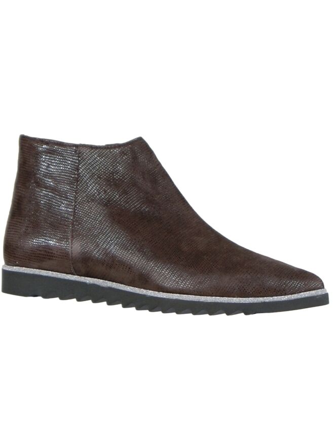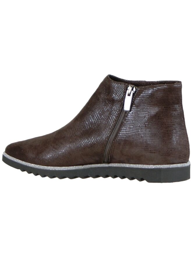 An ankle boot of the brand Evaluna in the color mocha brown. The leather is carried out in a fine reptile print and has a pointed toe. The sole is sporty jagged and along the edge of the insole runs a silvery, metallic ribbon. The inside of the boot is lined with leather.