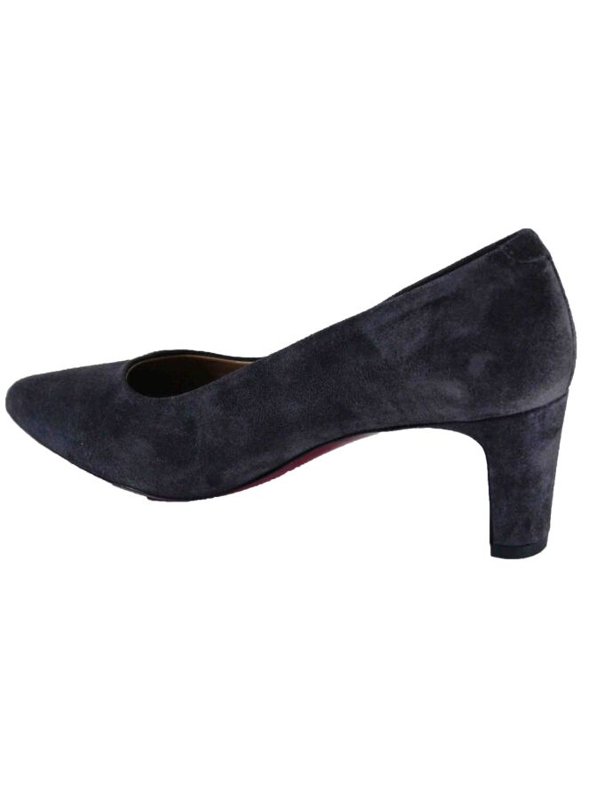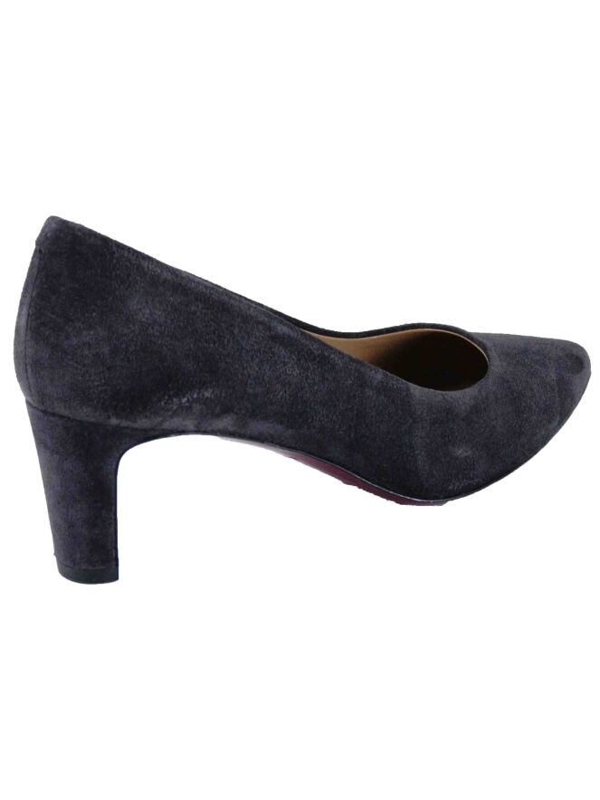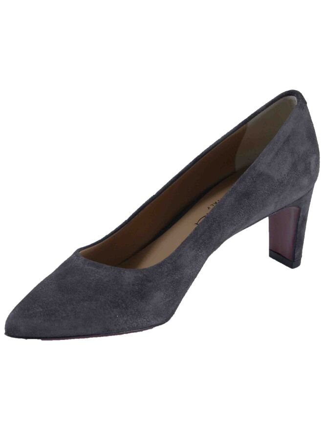 A pump of the brand Evaluna in the dark grey color. The pump has a pointed toe and the elegant heel is covered in the same material as the pump. The inside of the pump is lined with leather.