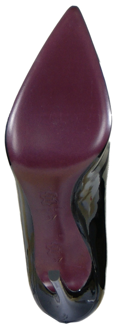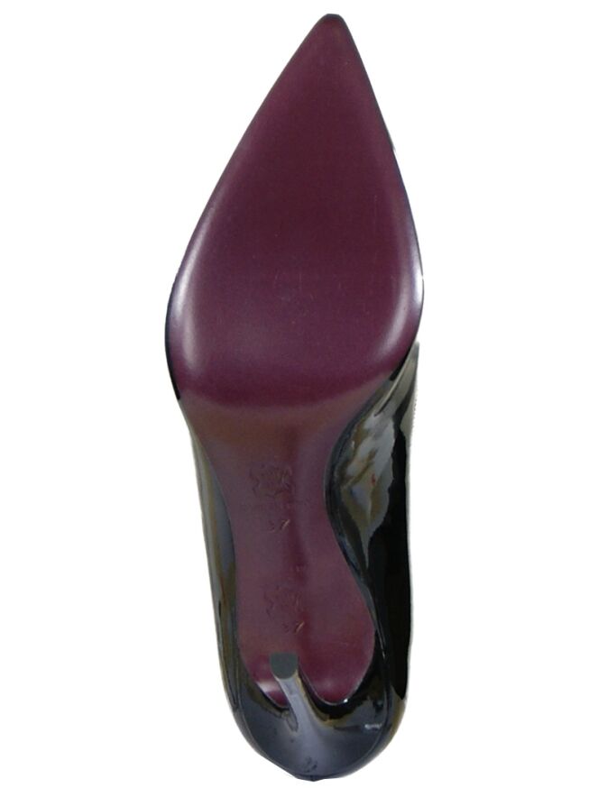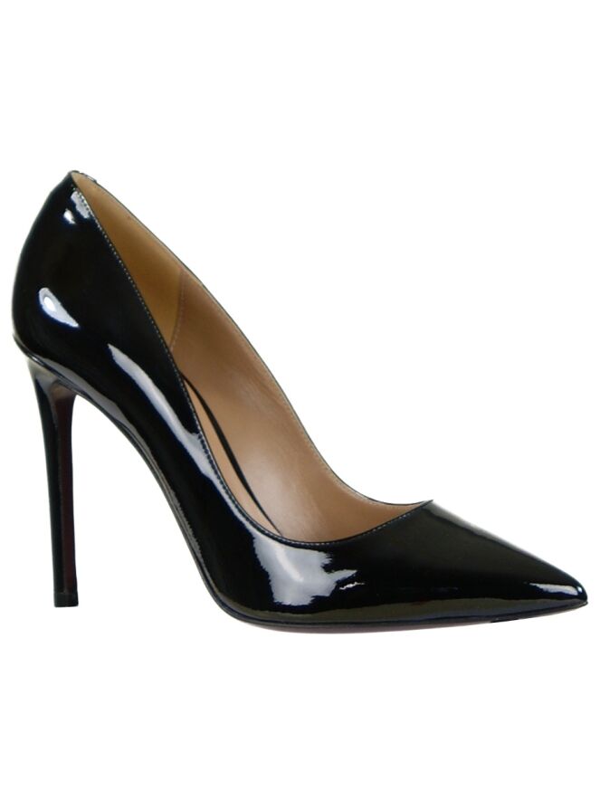 An elegant pump by the brand Evaluna in black patent leather. The pump has a pointed toe and has a stiletto heel from 10 cm high. The pump is on the inside with leather lined.