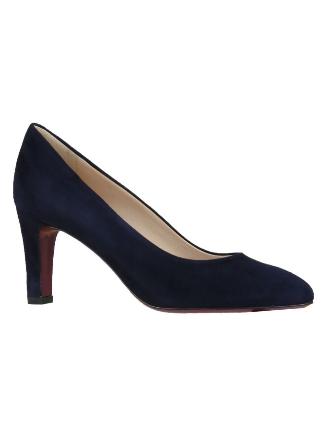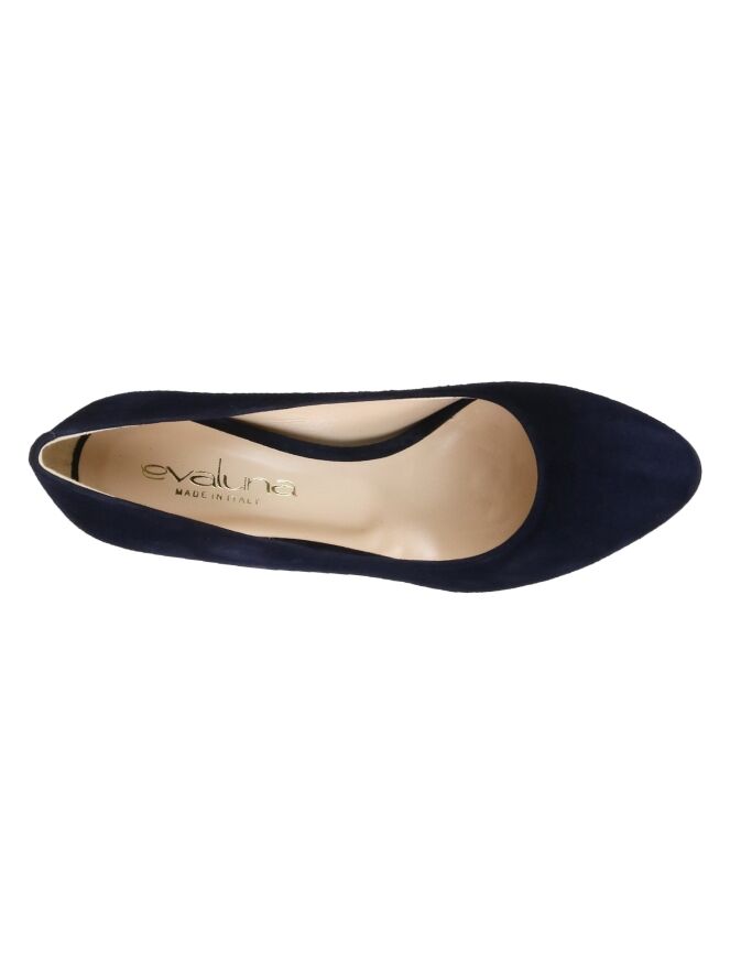 A pump by Evaluna in the color navy blue. The pump is in soft camoscio suede and has a slender round toe. The elegant heel is covered in the same leather as the pump. The inside is lined with leather.