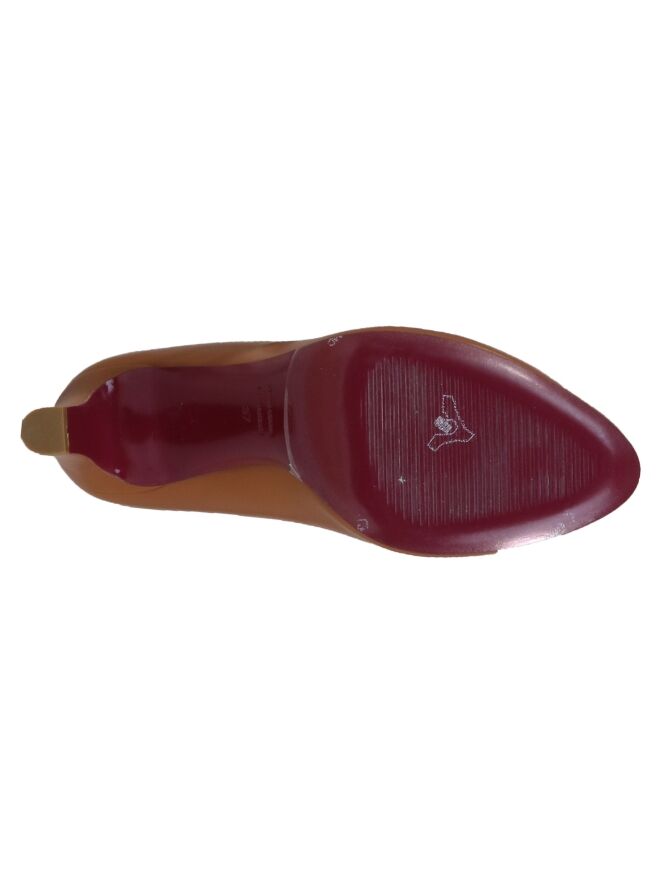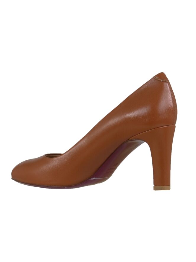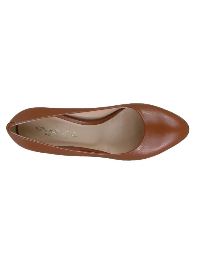A pump from Evaluna in the color cognac. The pump is in soft nappa leather and has a slender round toe. The elegant heel is covered in the same leather as the pump. The inside is lined with leather.