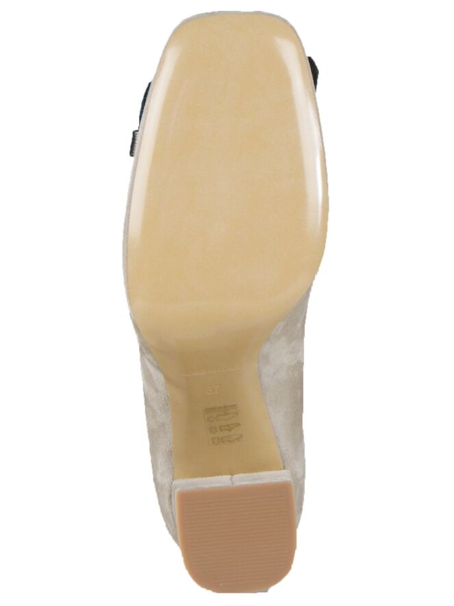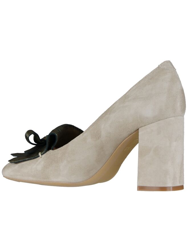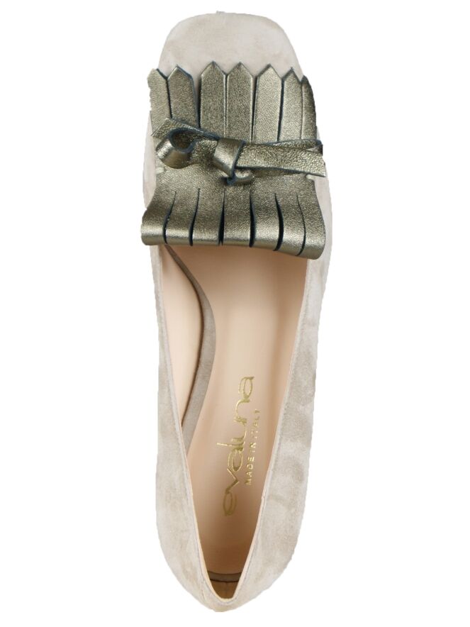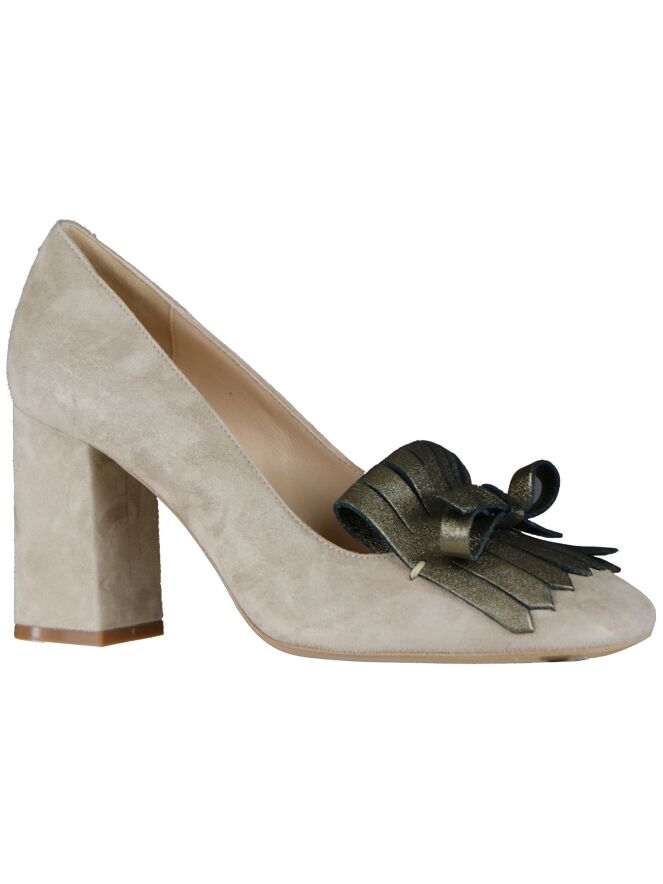 A pump of the brand Evaluna in the color taupe. On the forefoot is a bronze-colored jamboree with a bow. The pump has a high block heel that is coated in the same material as the pump. On the inside the pump is lined with leather.