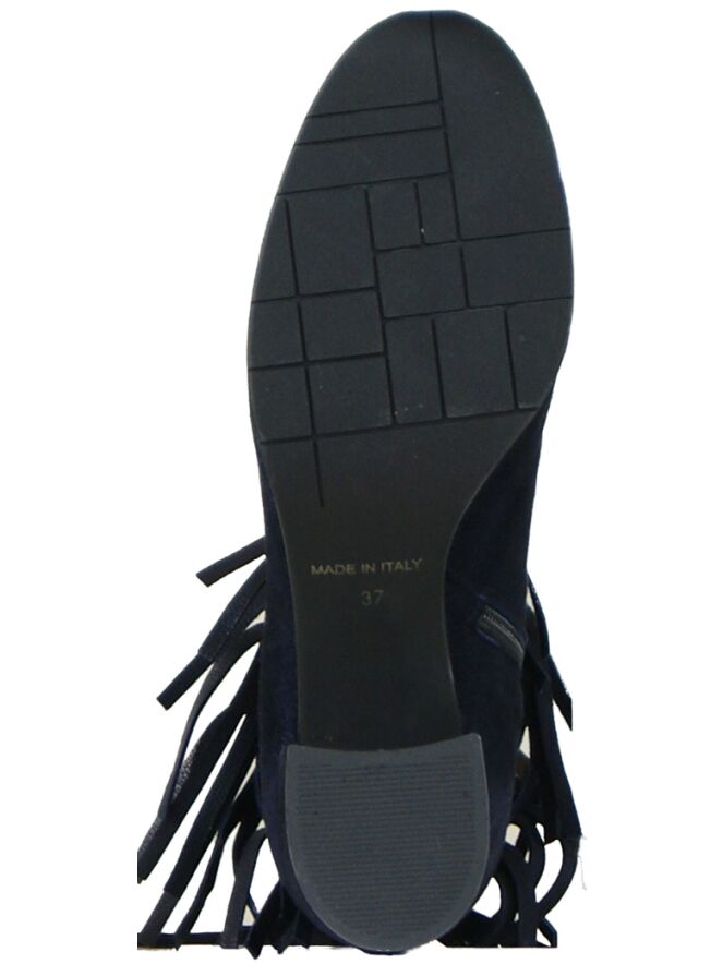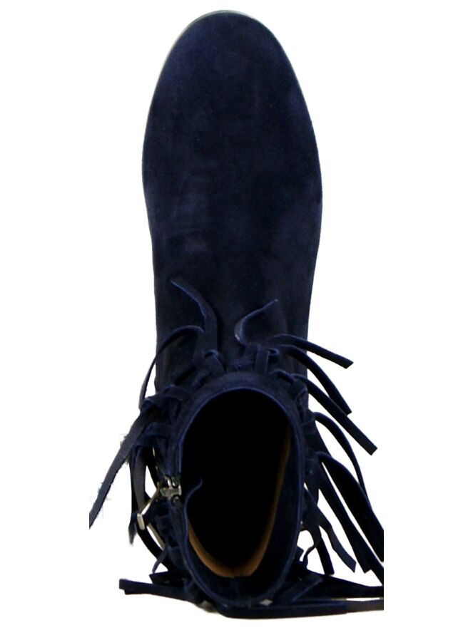 An ankleboot by the brand Evaluna in the color Navy Blue. Along the top of the shaft are braided fringles confirmed. The boot has a round toe and a round block heel. The boot is leather lined on the inside.