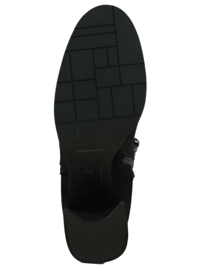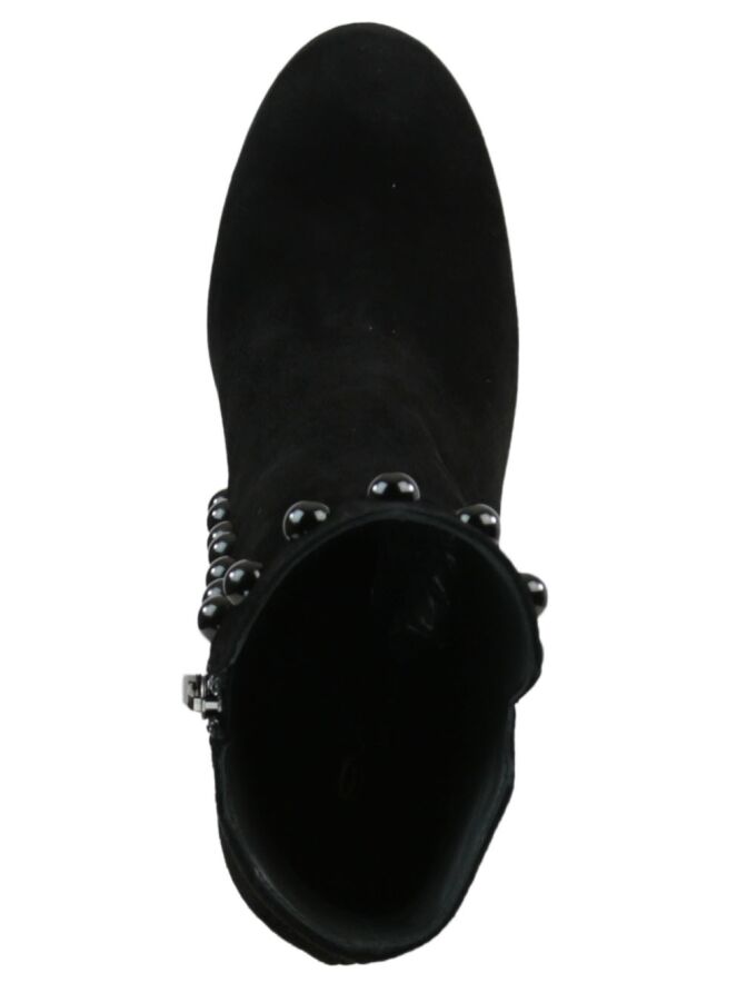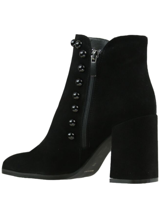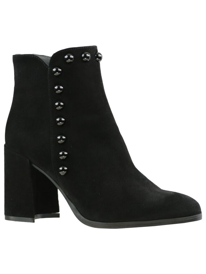 A ankleboot of the brand Evaluna in the color black. Along the seams on the sides are round shiny black studs. The height is from the heel 10 cm high and the shaft circumference is 28 cm. On the inside is a zipper and the boot is leather lined on the inside.
