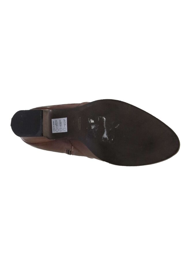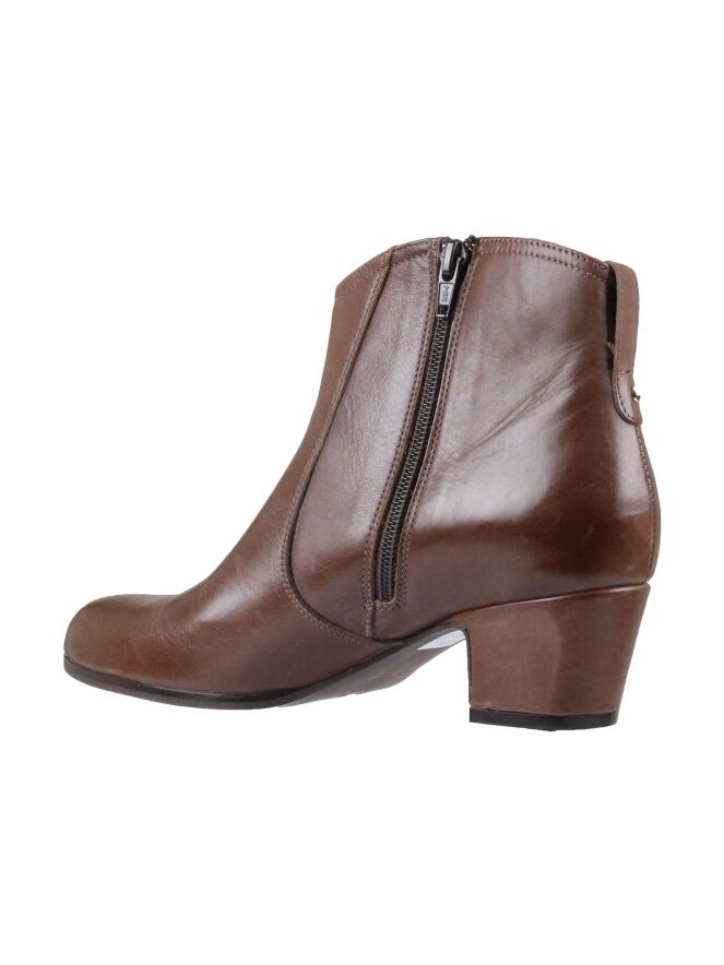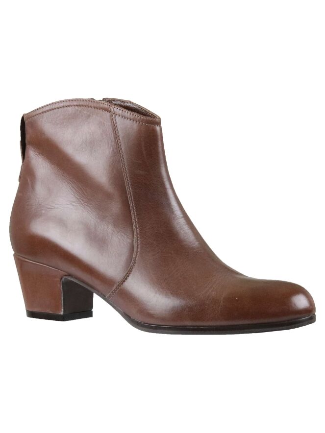 An ankle boot from Evaluna in the color brown. The heel is slanted from behind. There is a short lip on the heel. The inside is lined with leather.