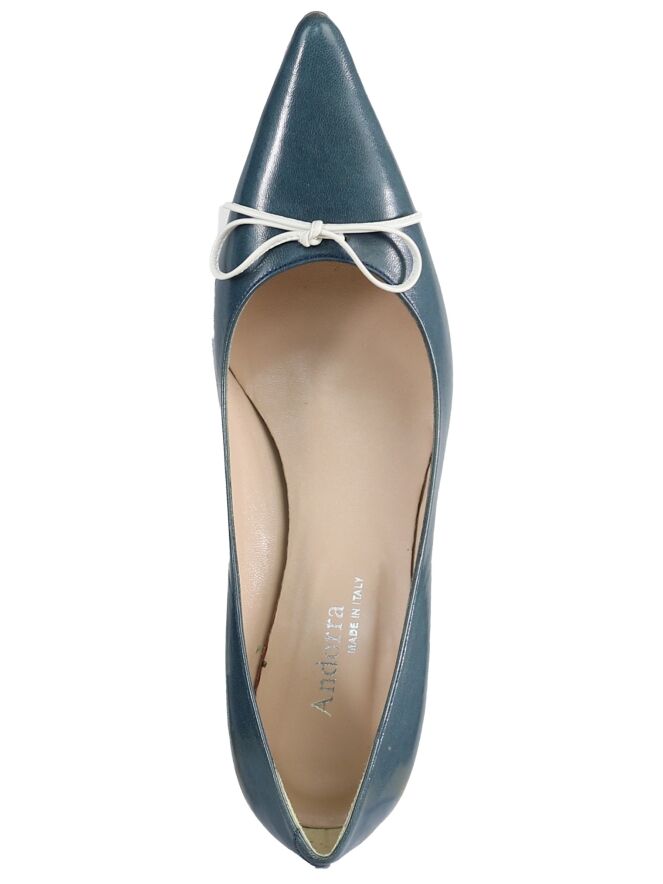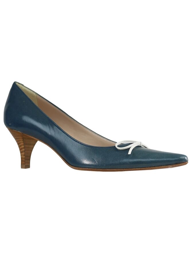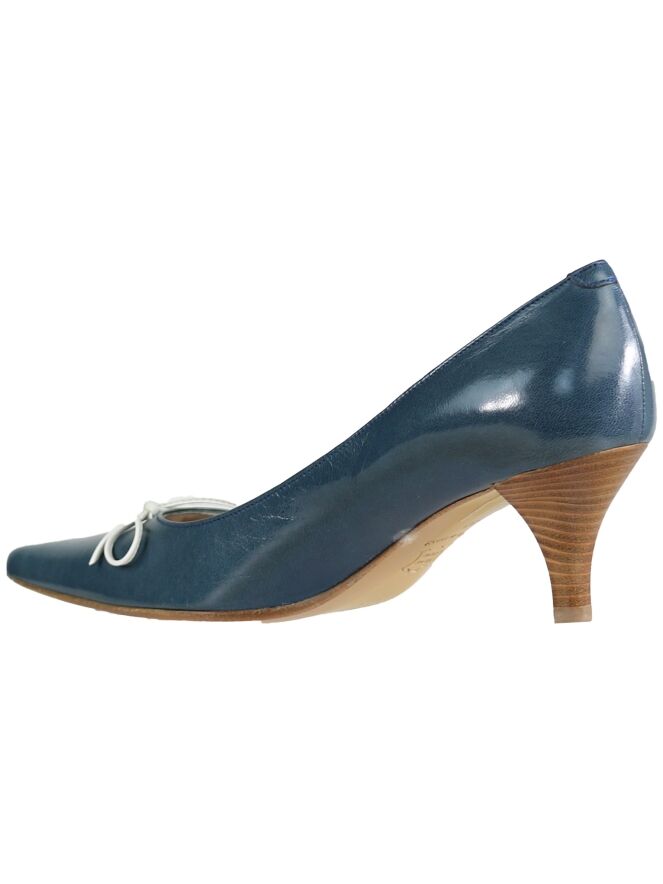 A pump from Even and odd in the color blue. on the foot is a white leather bow. The pump has a pointed toe and a slender heel. the inside is lined with leather.