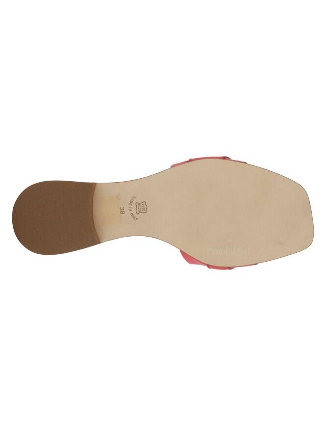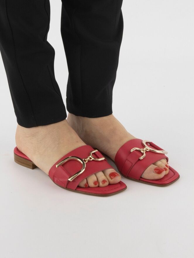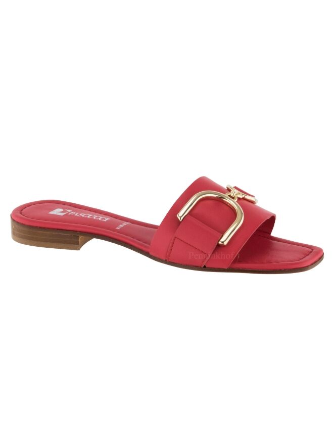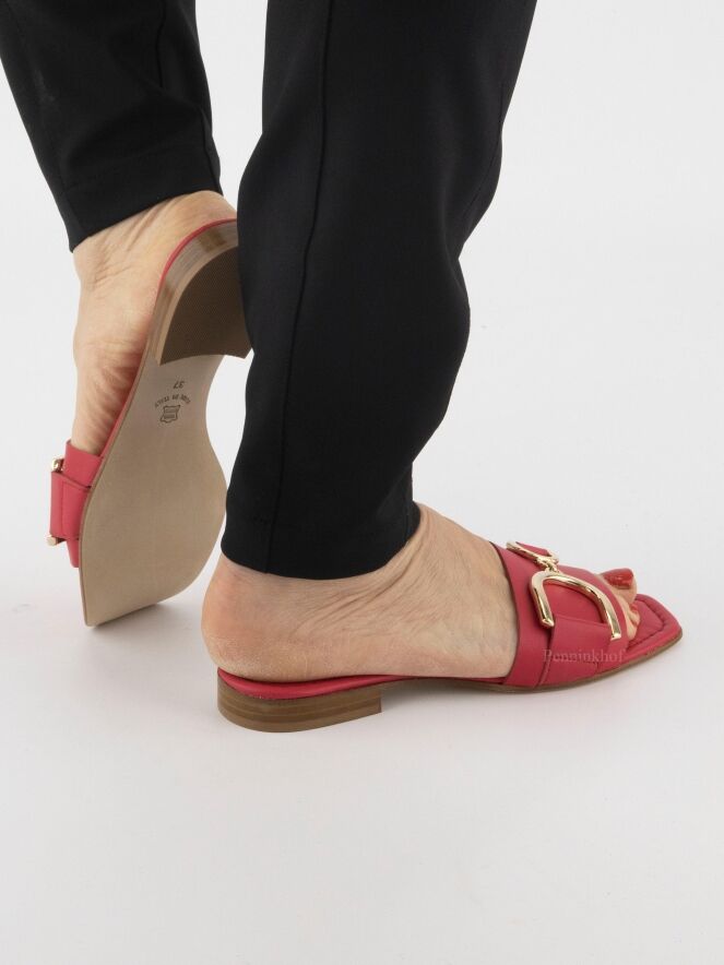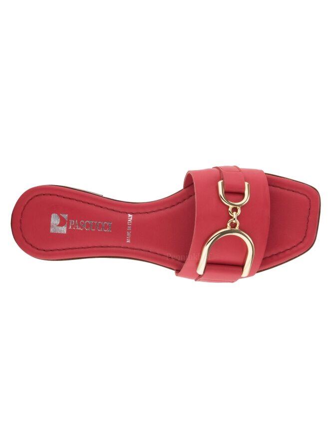 A slipper by Even and Odd (Pascucci) in coral red leather. There is a gold-colored bit on the forefoot. The footbed is made of leather in the color coral red.