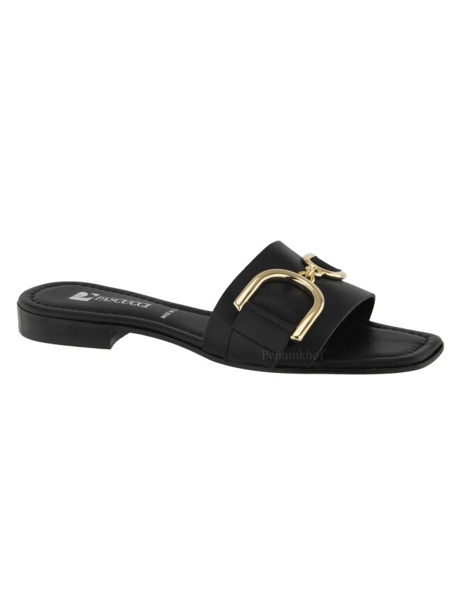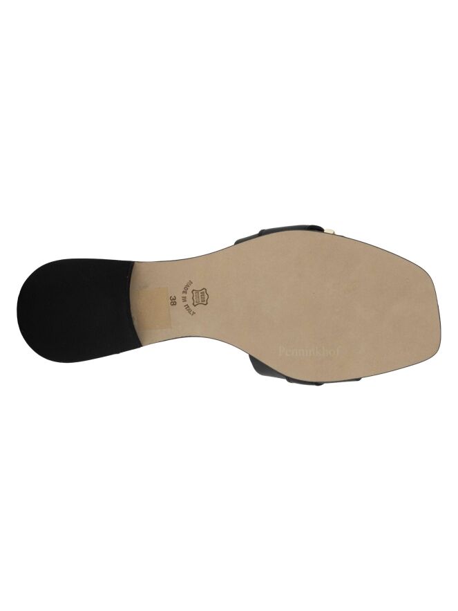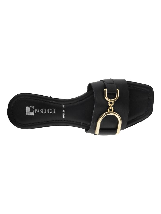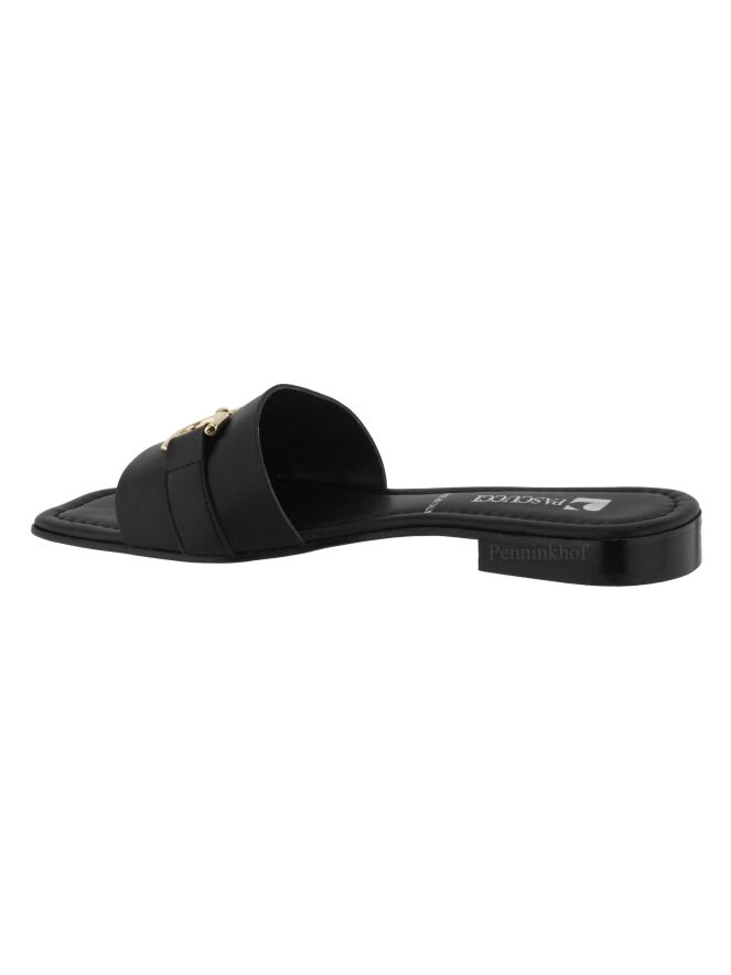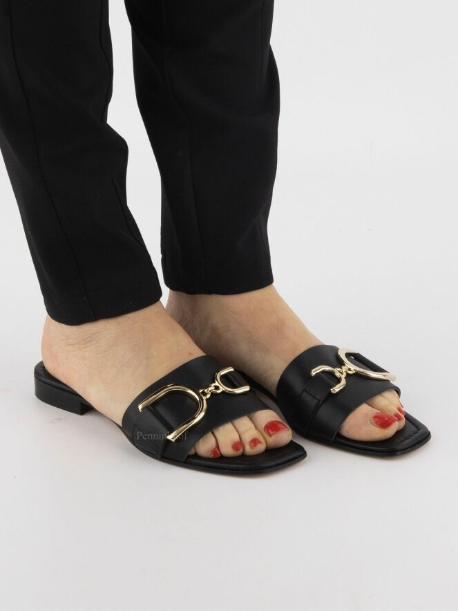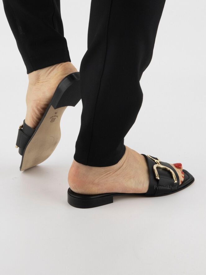 A slipper from Even and Odd (Pascucci) in black leather. There is a gold-colored bit on the forefoot. The footbed is made of leather in the color black.