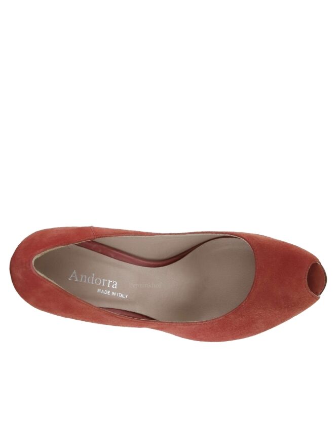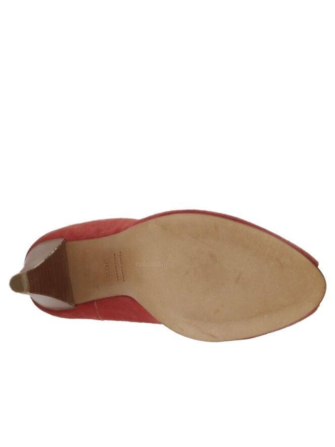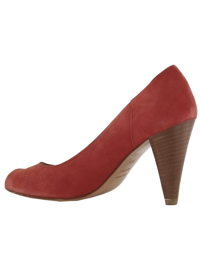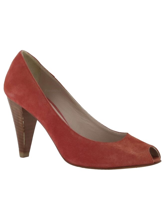 A pump from Even and Odd in the color red. The pump has an open toe. The slim heel is in a neutral wood color.