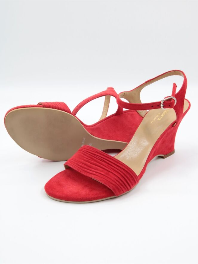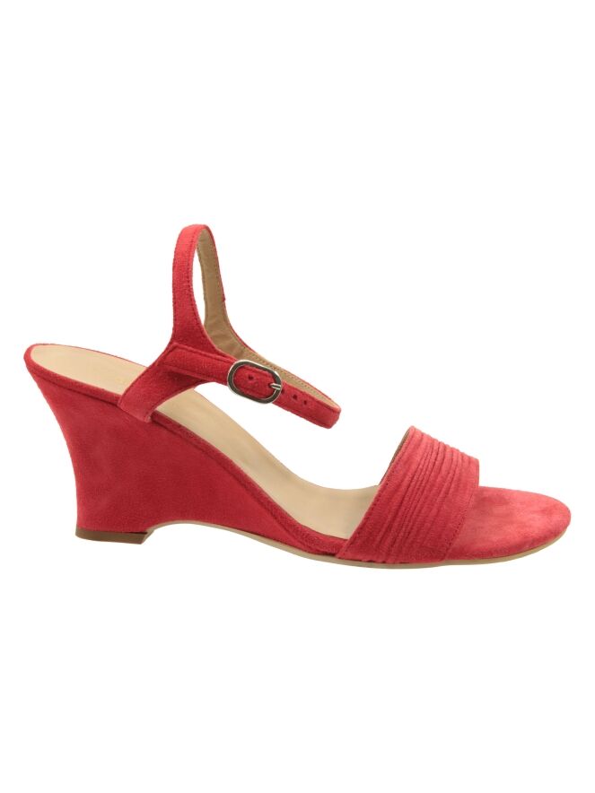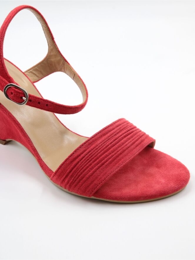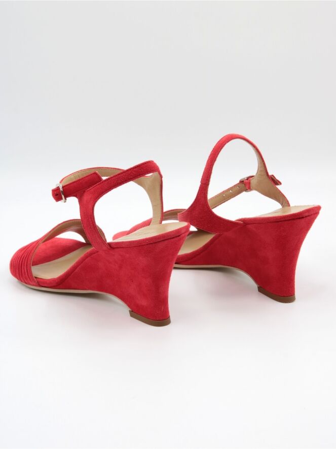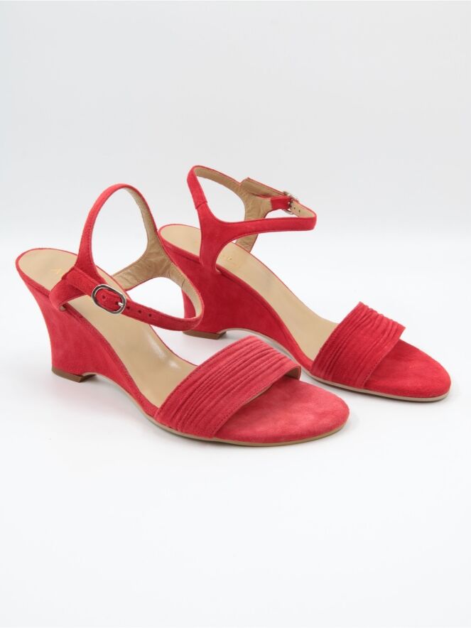 An open-toe sandal from Even and Odd in coral red. The wedge heel is covered in the same material as the sandal itself. The wide strap across the forefoot is finely ribbed. The ankle strap is adjustable.