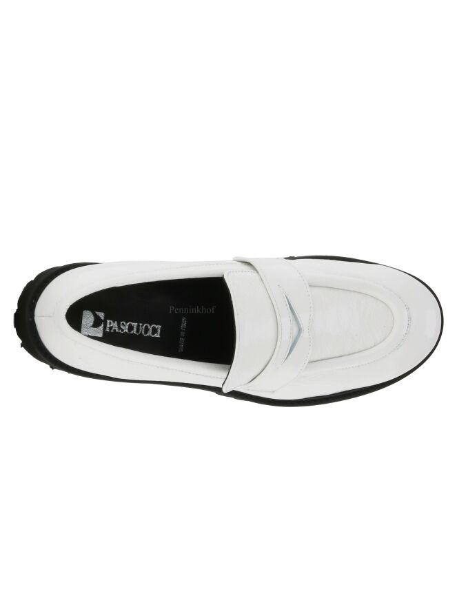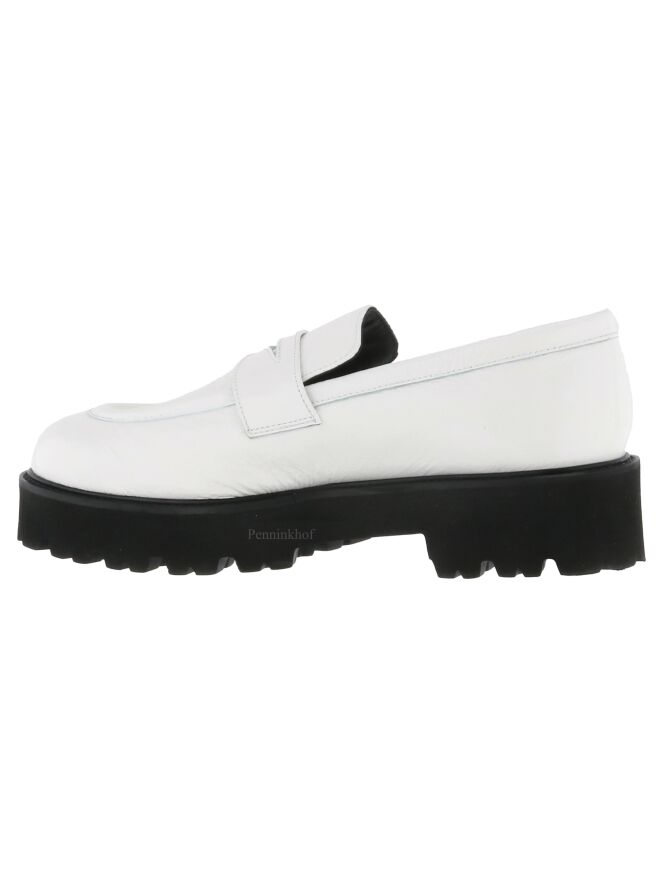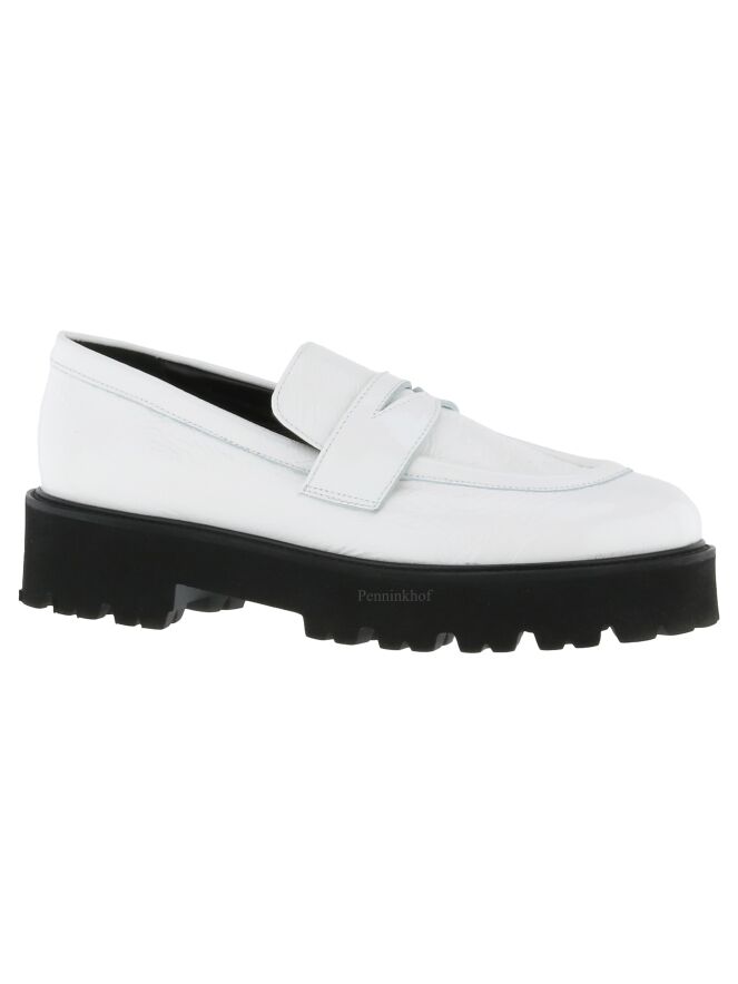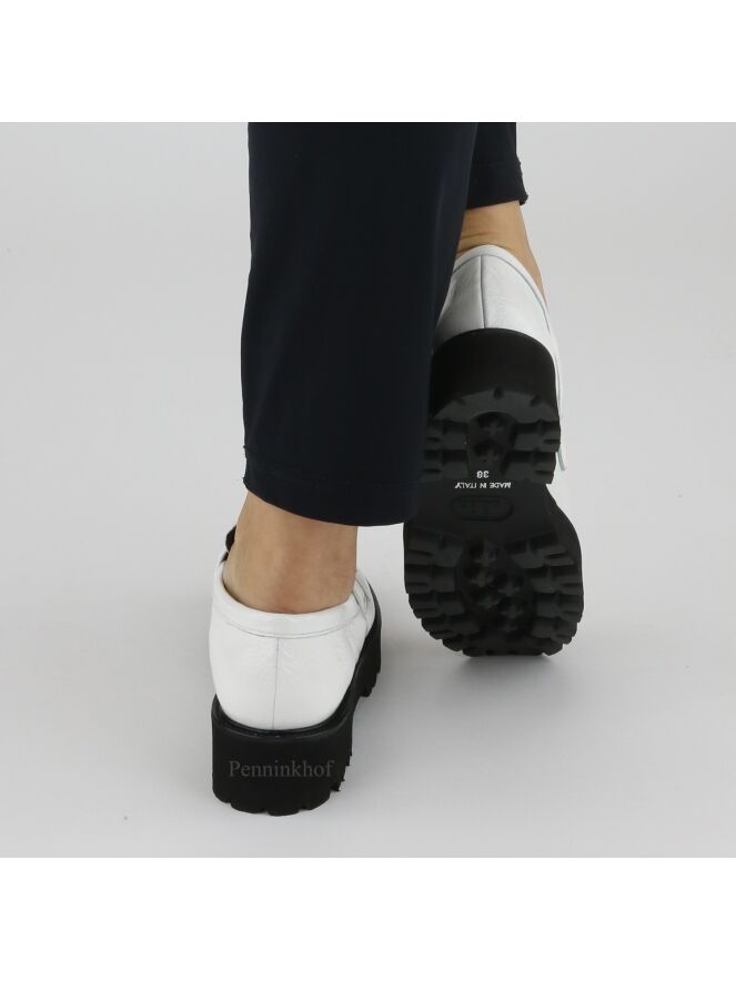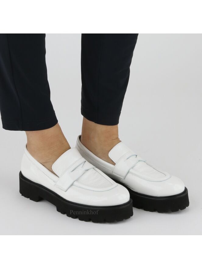 A slip-on from Even and Odd in a white wrinkle lacquer. The platform sole is serrated. The inside is lined with leather.