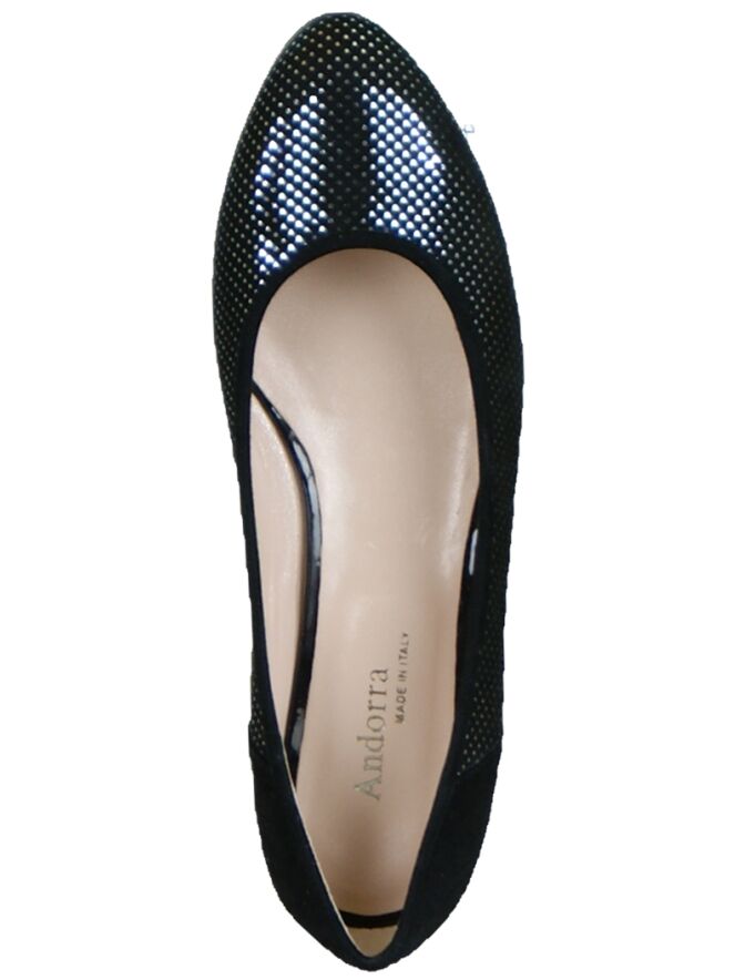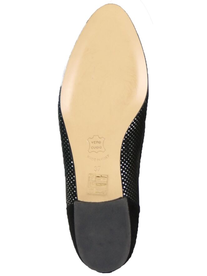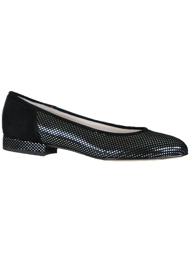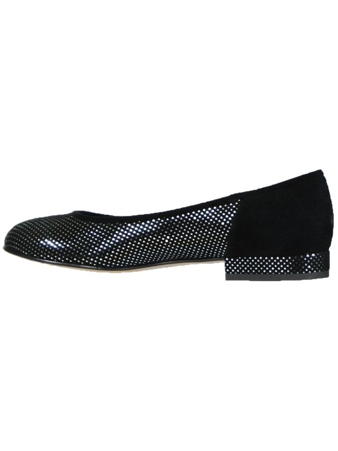 A ballerina of the brand Even &Odd in a black color with silver. The ballerina has a round toe and suede of the forefoot and sides is decorated with small silver dots. This detail comes back in the heel. The ballerina is lined on the inside with leather.