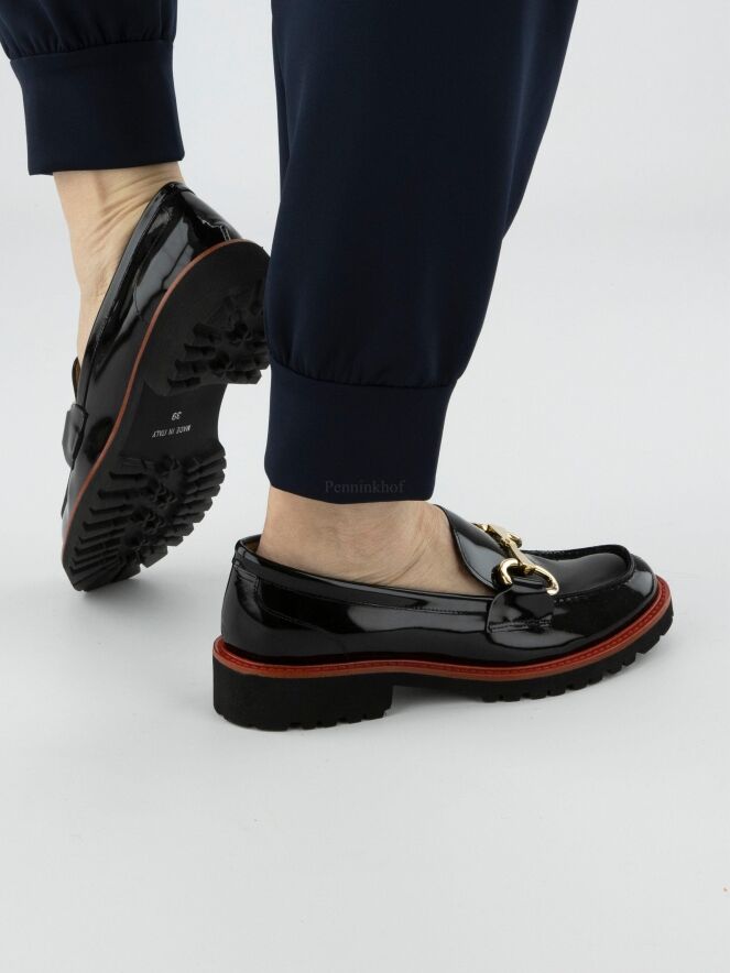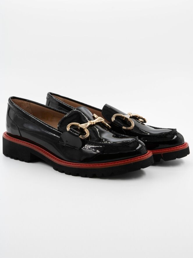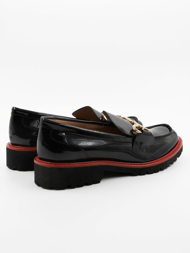A loafer from Even and Odd (Pascucci) in black patent leather. On the forefoot is a buckle in a soft gold colour. The edge of the serrated sole is red. The inside is lined with leather.