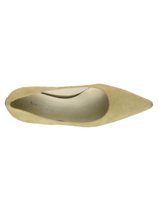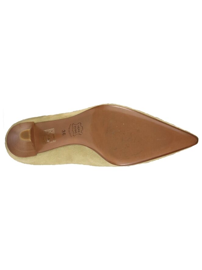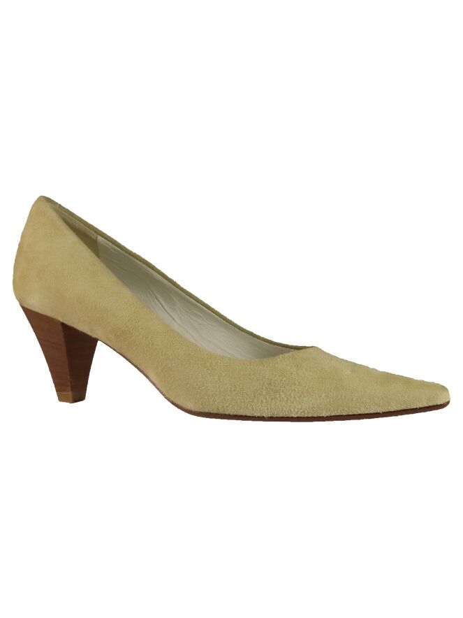 A pump from the brand Even and Odd in the color sand. The elegant heel is in a wood color. The pump has a pointed toe. The inside of the pump is lined with leather.