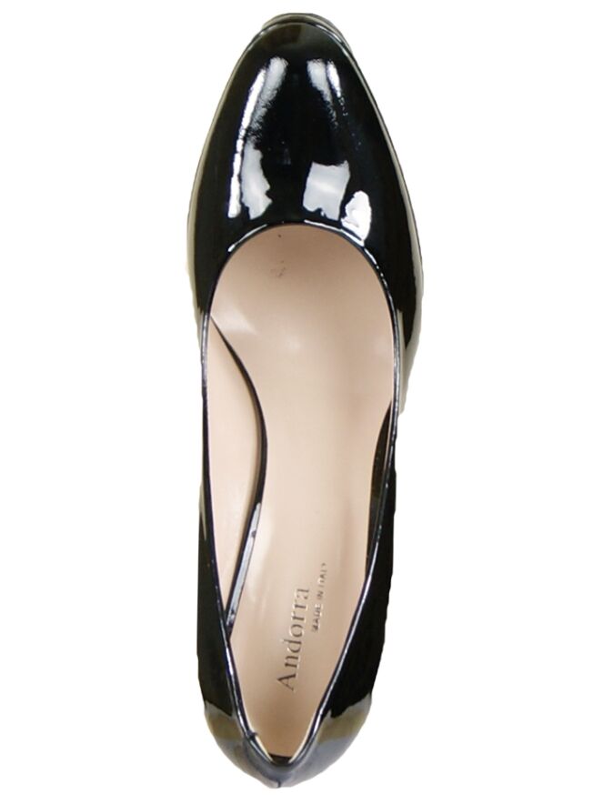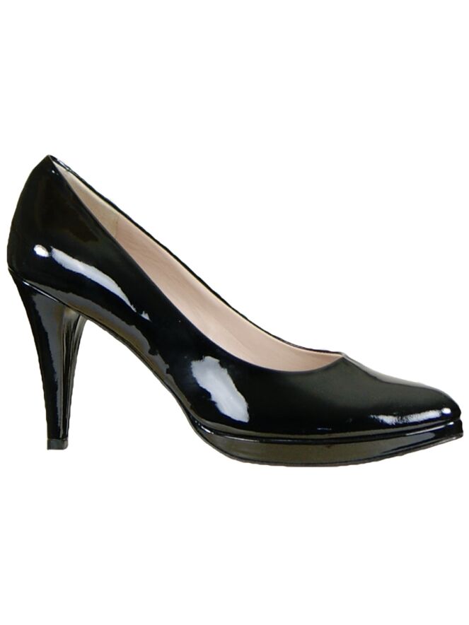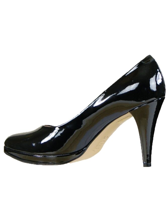 A pump in patent leather of the brand Even & Odd in the colour black. The pump has a round toe and the heel is in the same material as the pump. The inside of the pump is lined with leather.