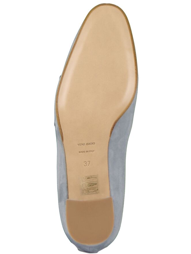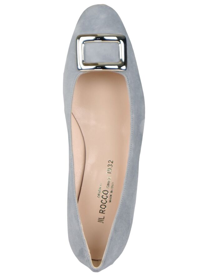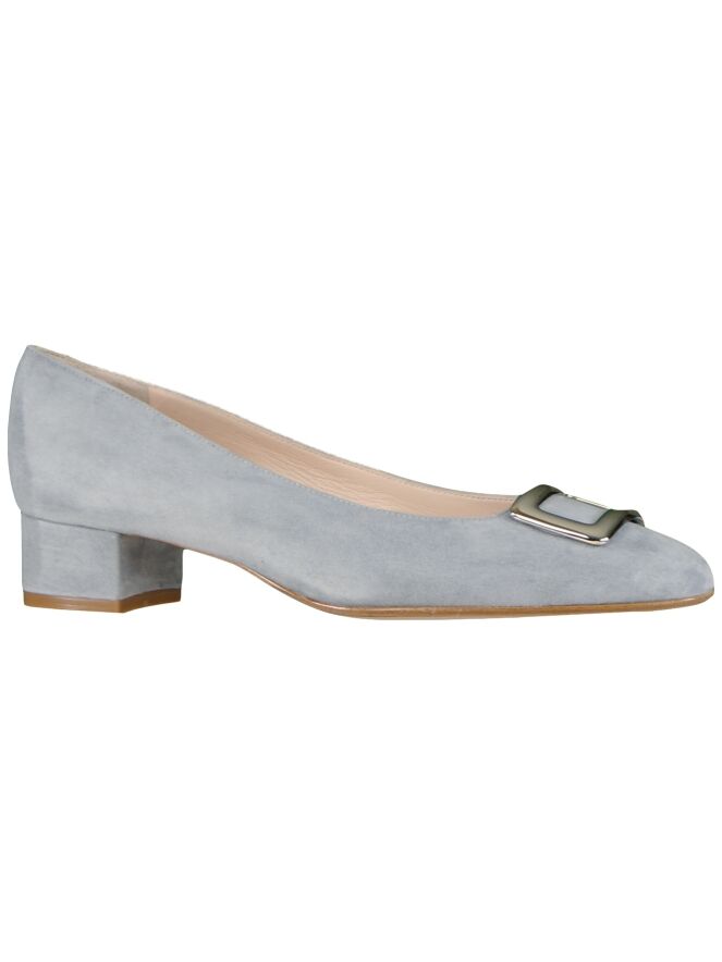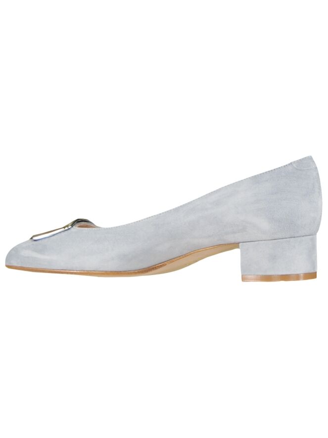 A pump of the brand Even & Odd in a light grey color. The pump has a round toe and on the forefoot is a rectangular Silver buckle. The heel is in the same suede lined as the pump. The inside is lined with leather.