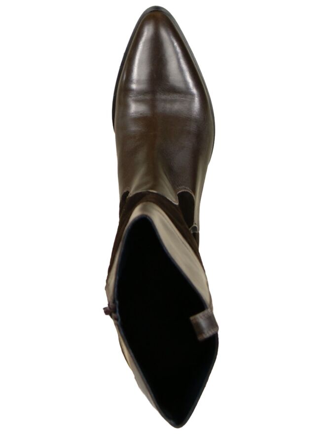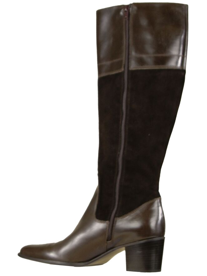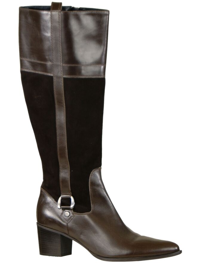 An elegant western boot of the brand Even & Odd in a Mocha brown color. the foot and the top of the shaft are in nappa leather and the middle part of the shaft is in suede. Along the outside of the shaft is a leather band with a nickel buckle at the ankle. On the inside is a zipper along the entire length of the shaft. The height is 42 cm and the circumference is 40 cm.