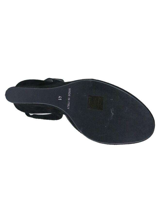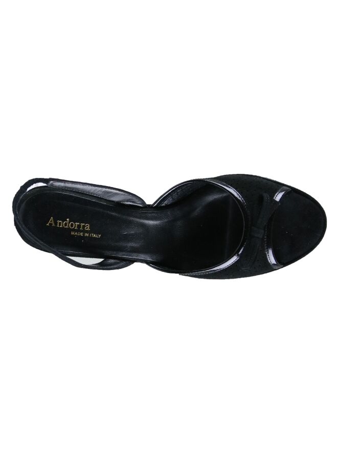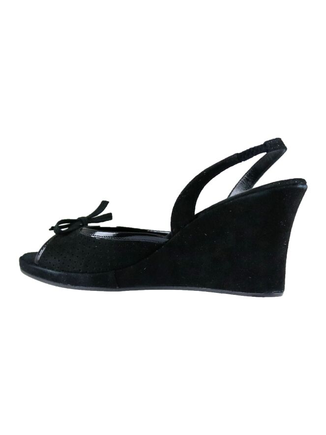 An open pump from Even & Odd in the color black. The suede is finely perforated and the edges have a black lacquer trim. There is a nice suede bow on the forefoot.