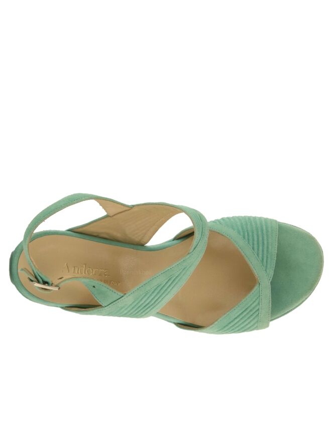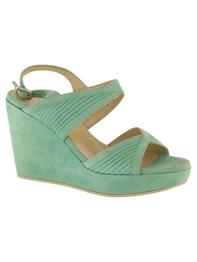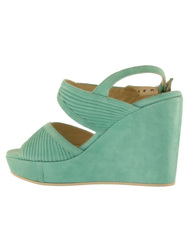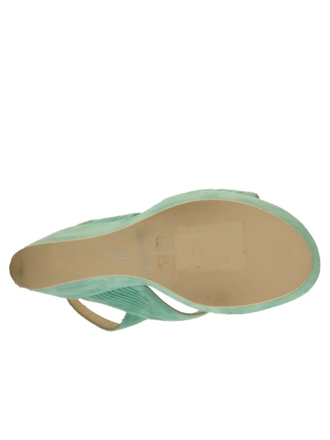 A sandal of the brand Even & Odd in the color turquoise with a wedge heel. The sandal has an open heel and an open toe. The suède is finely pleated. The inside of the pump is lined with leather.