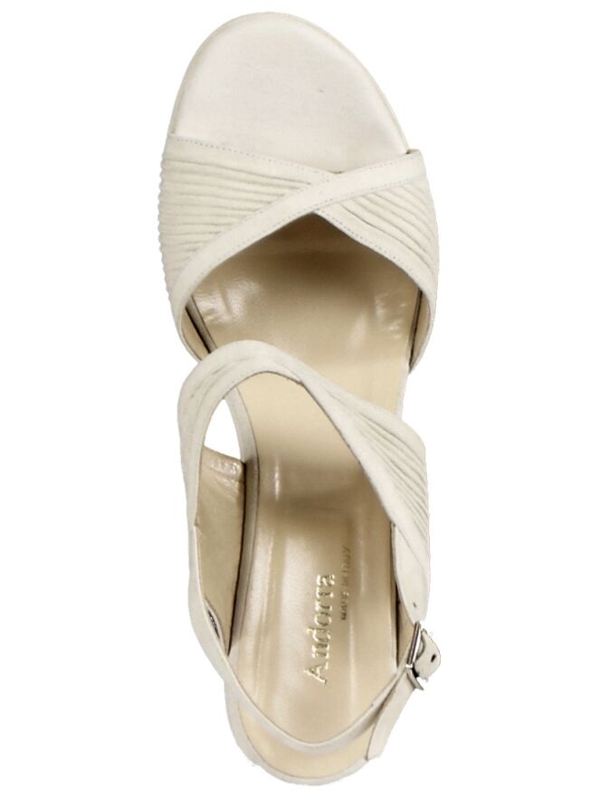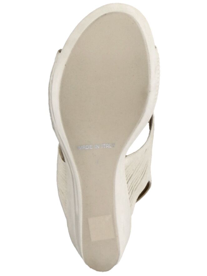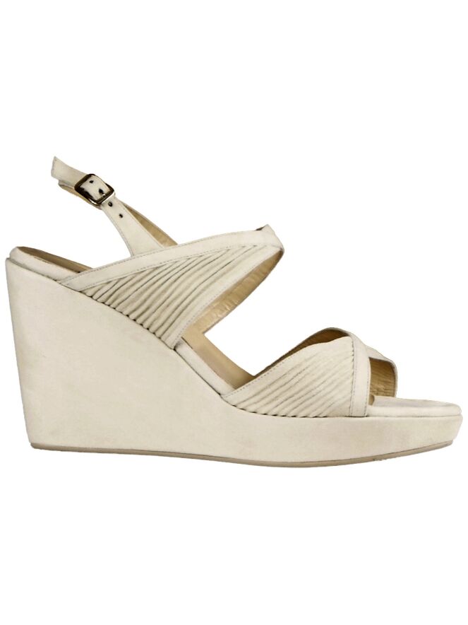 A sandal of the brand Even & Odd in the color beige with a wedge heel. The sandal has an open heel and an open toe. The suède is finely pleated. The inside of the pump is lined with leather.