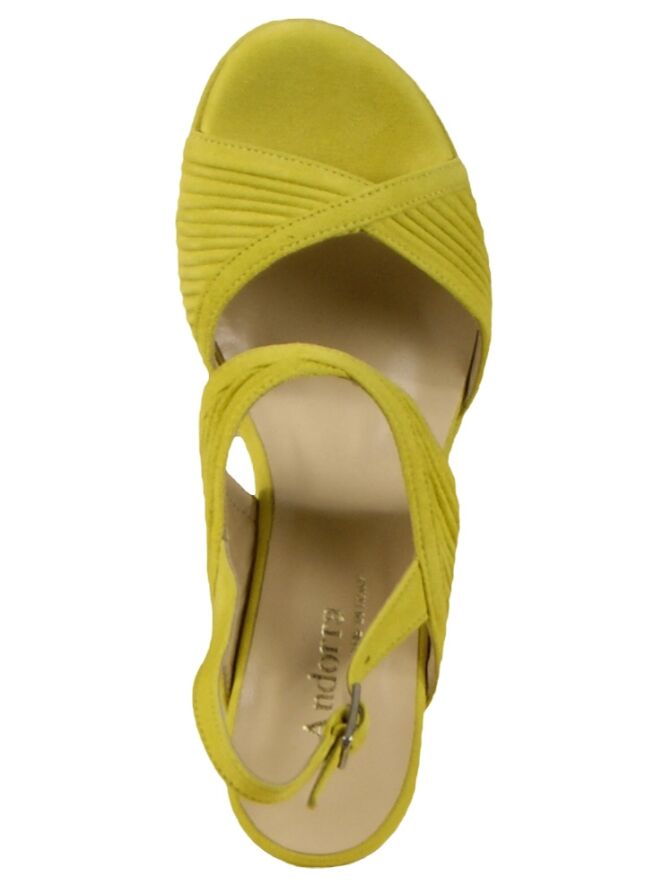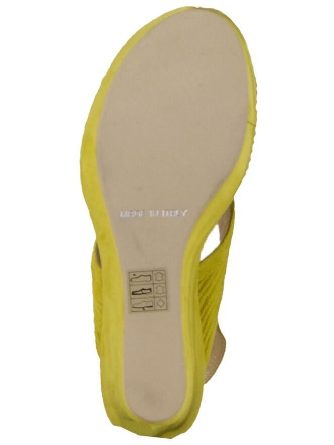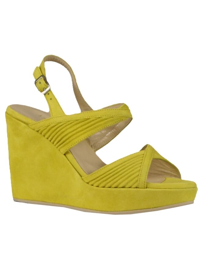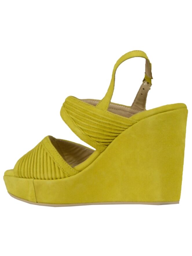 A sandal of the brand Even & Odd in the color lemon yellow with a wedge heel. The sandal has an open heel and an open toe. The suède is finely pleated. The inside of the pump is lined with leather.