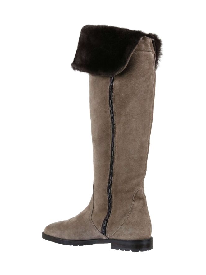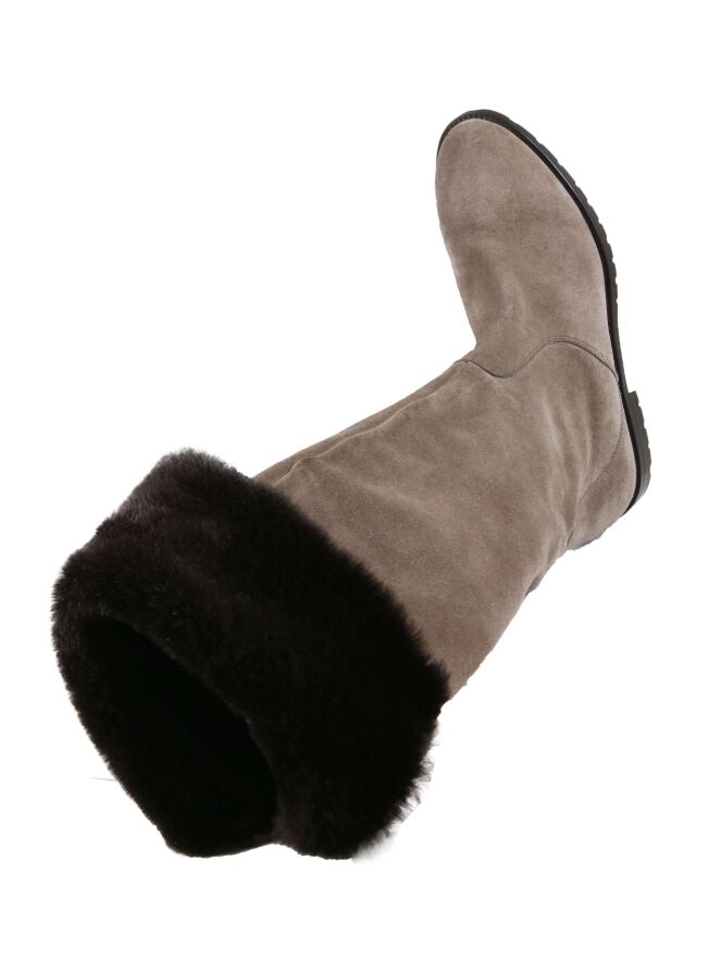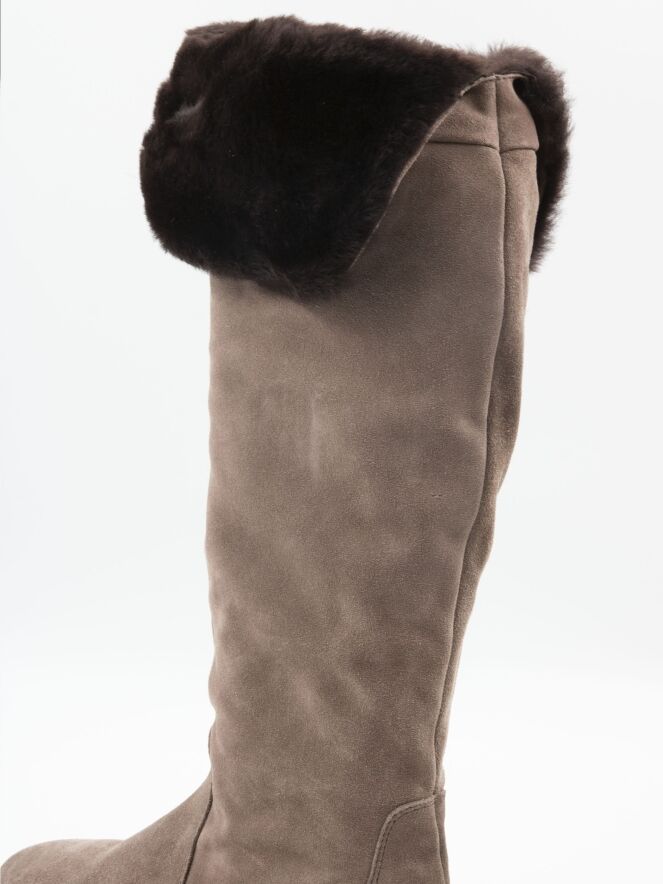 A boot from "Even and Odd" in the color camel. There is a zipper on the inside of the shaft. At the top of the shaft is a faux fur cover in the color dark brown. The inside is lined with leather.