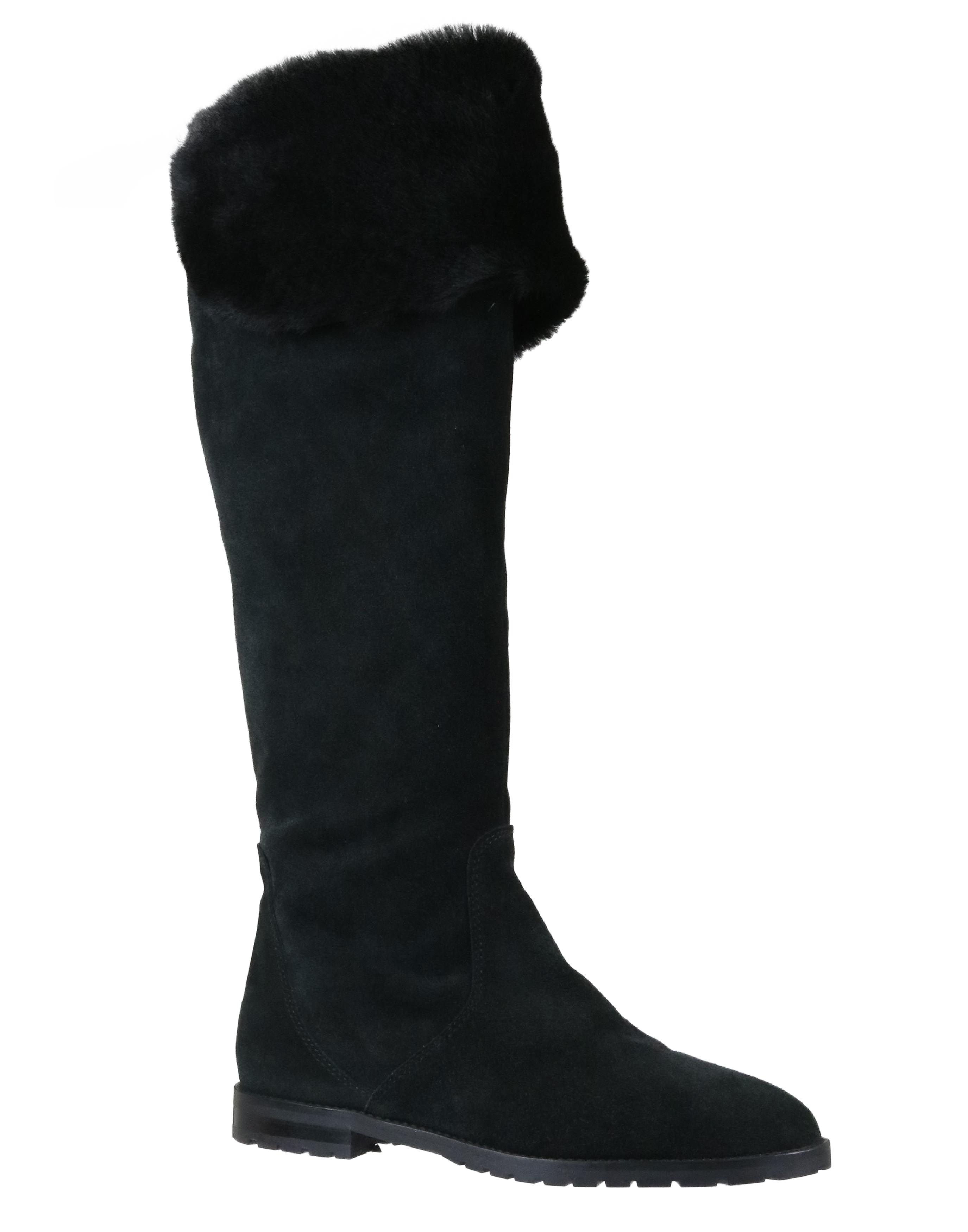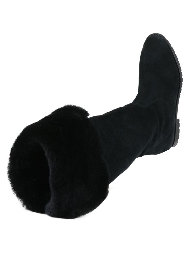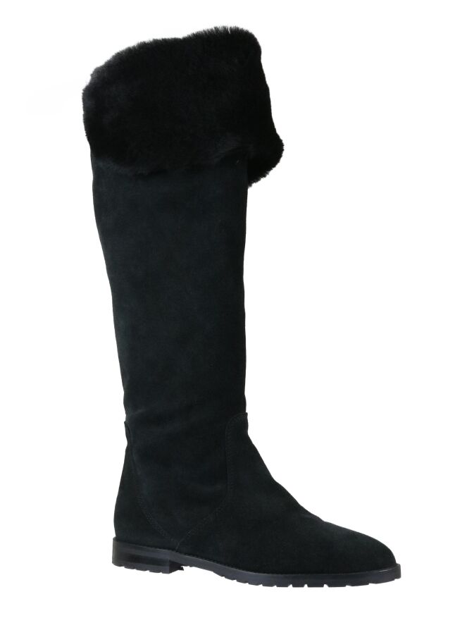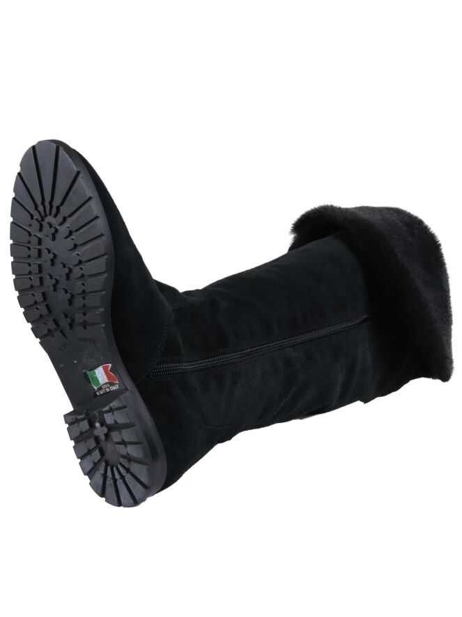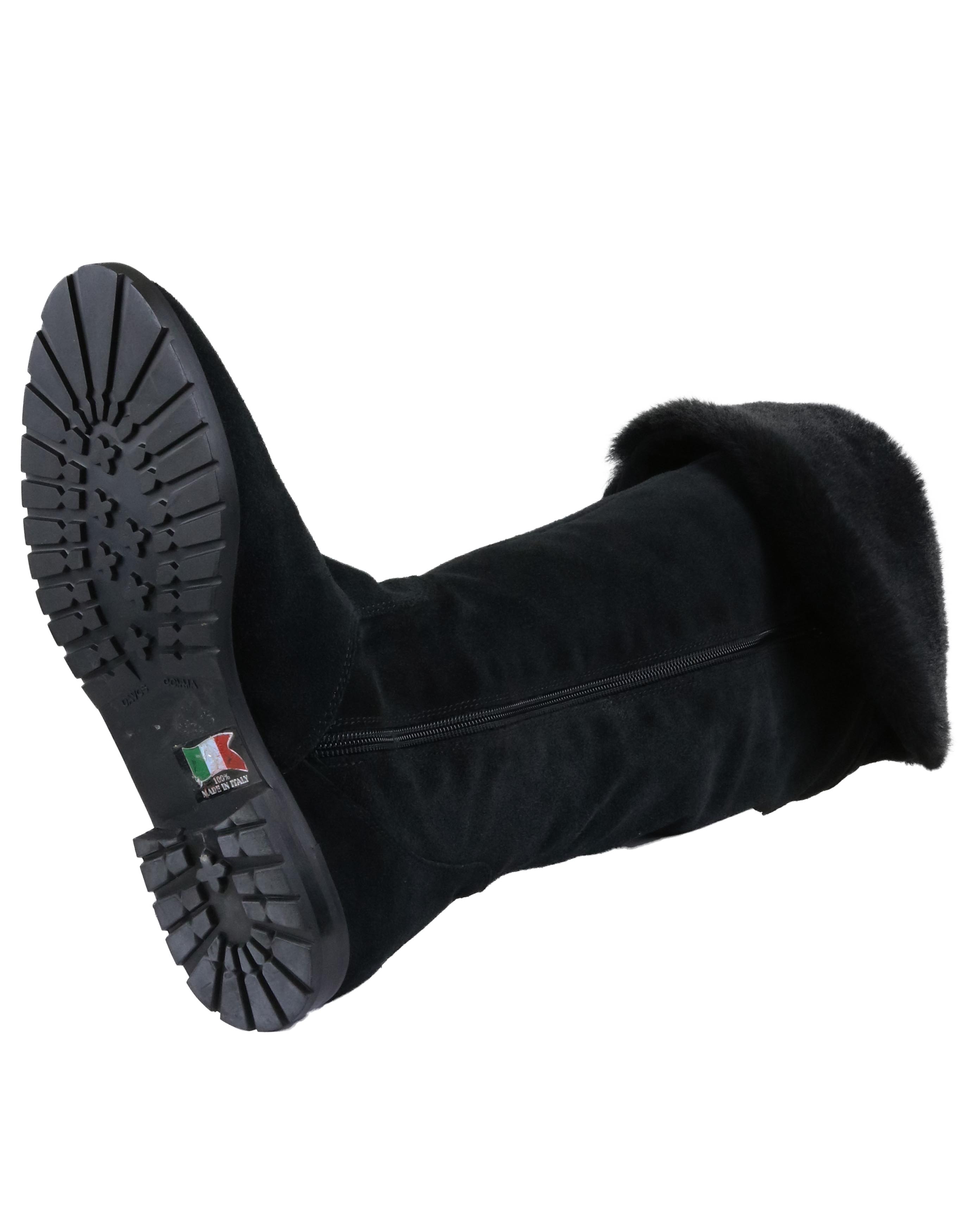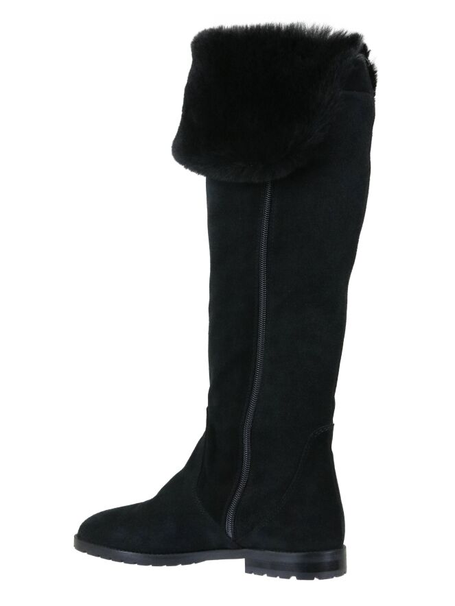 A boot from "Even and Odd" in the color black. There is a zipper on the inside of the shaft. At the top of the shaft is a faux fur cover. The inside is lined with leather.
