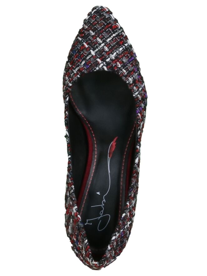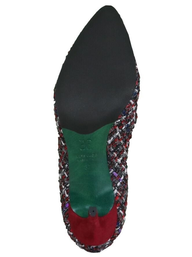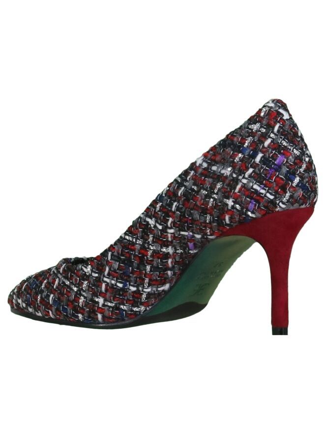 A pump of the brand Fabi in a tweed fabric with the colors black, grey, white and red. The pump has a pointed toe and has a narrow elegant heel in black color. The inside is lined with leather. This pump has a bag with item number: 404003351