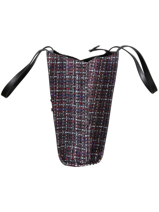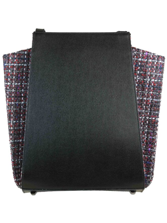 A bag of the brand Fabi in black leather with on the sides a tweed fabric with shades of purple, red, white and black. The bag has one compartment with a 2nd bag on the inside. The leather has a magnetic snap button closure. At this bag belongs also a pump.