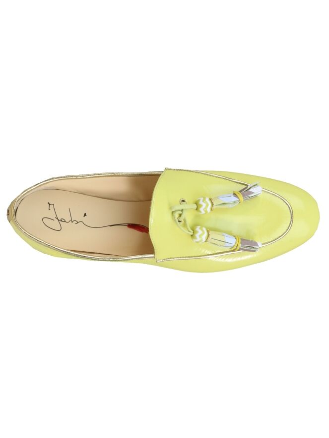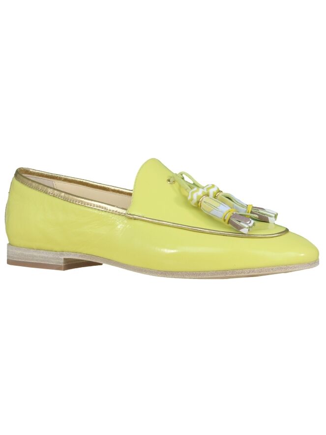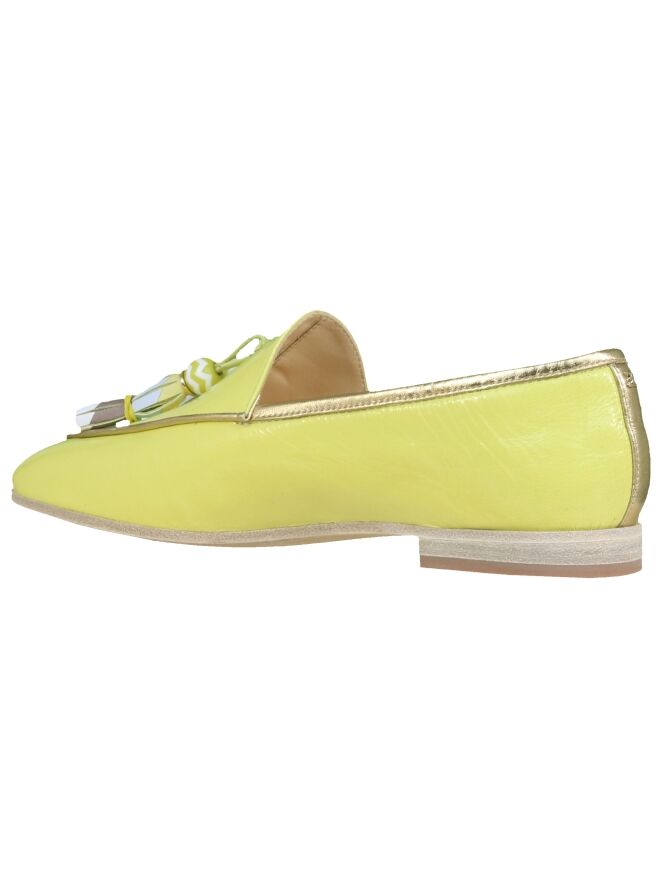 A luxurious slip-on by Fabi in a lime pistachio color. The piping over the forefoot and the edge of the shoe are in a gold color. On the forefoot are 2 tassels in the colors lime, lavender and taupe. The insole is removable and the inside is lined with leather.