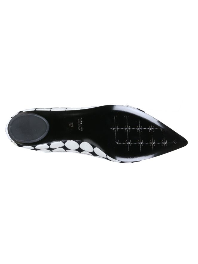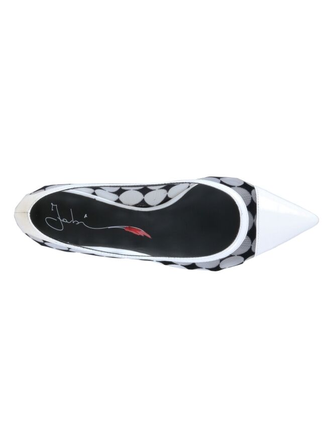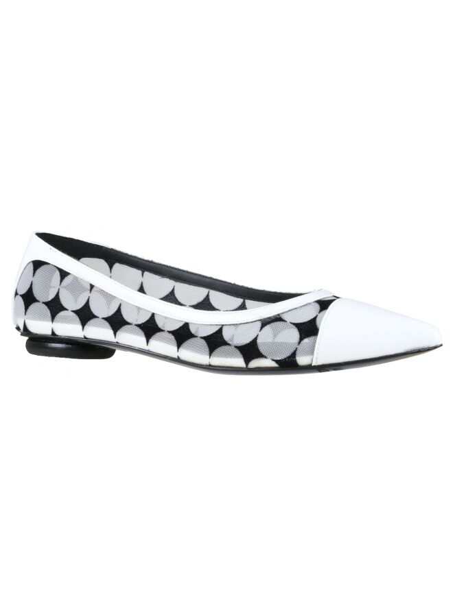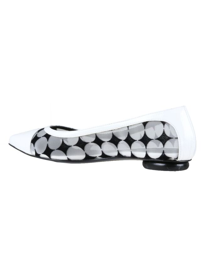 A ballerina by Fabi in the color white. The pointed toe and the edge is in spazzolato leather. The sides and a part of the forefoot is a soft transparent mesh in a graphic print with black.