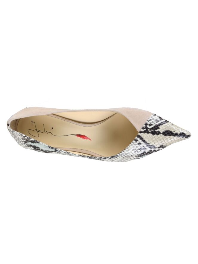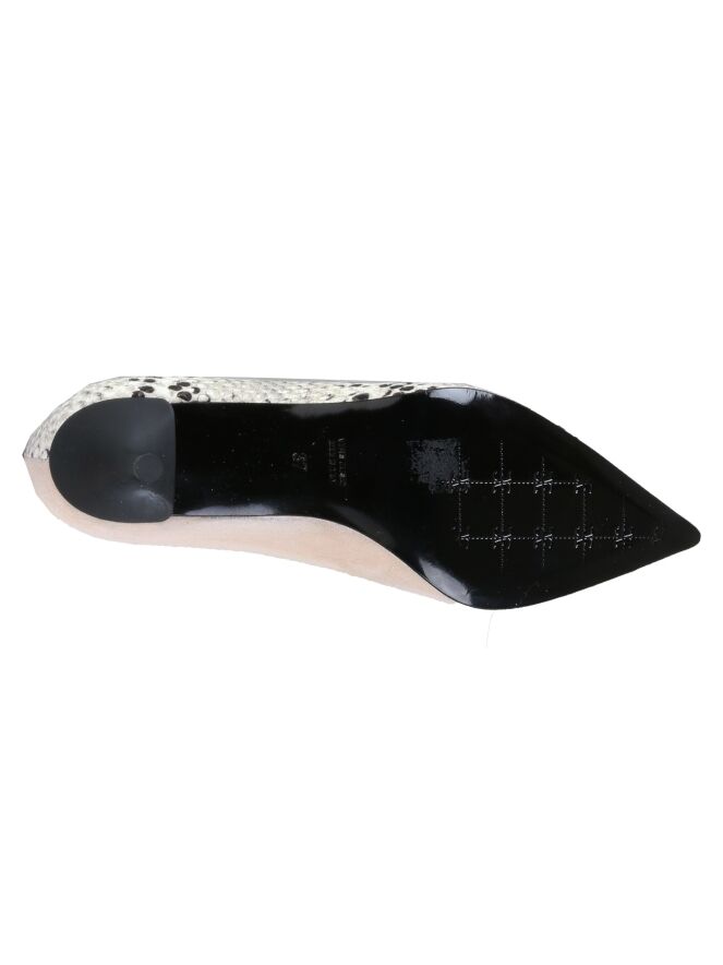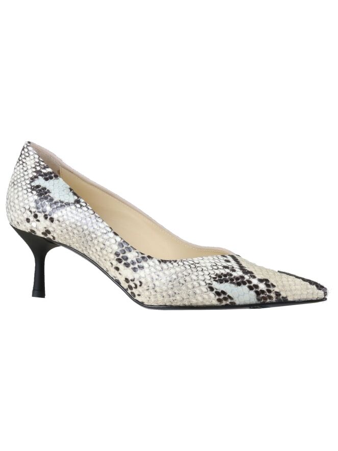 A pump from Fabi whose exterior and forefoot are in a reptile print with the colors creamy white, gray and black, and the inside in a nude camoscio suede. The pump has a pointed toe and a queeny heel in the color black. The inside is lined with leather.