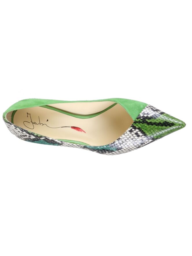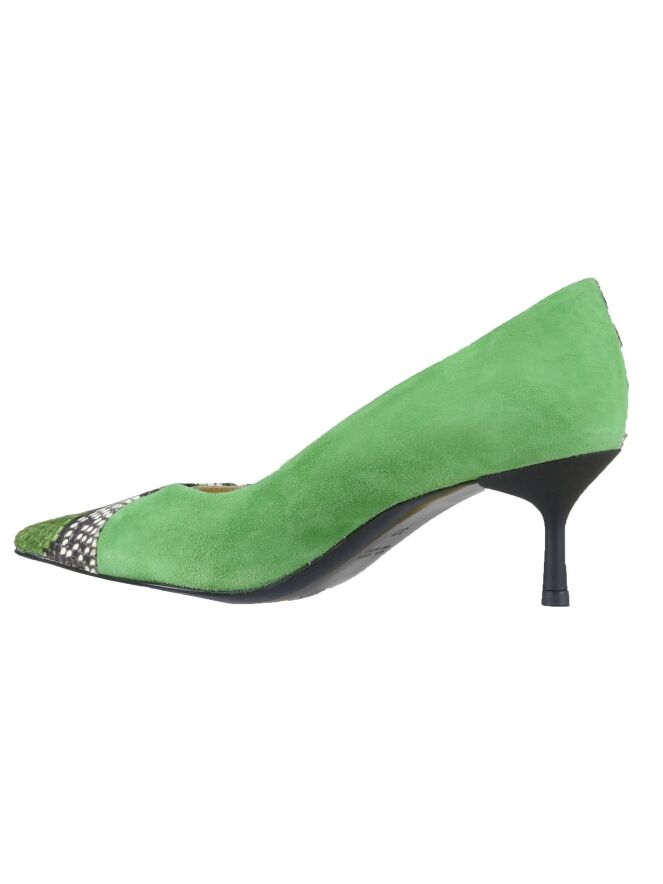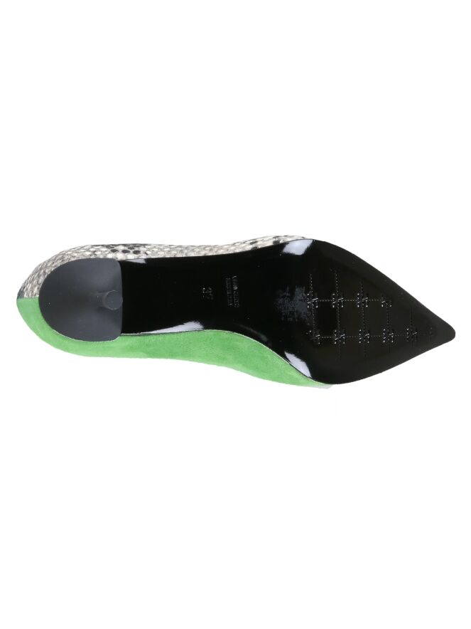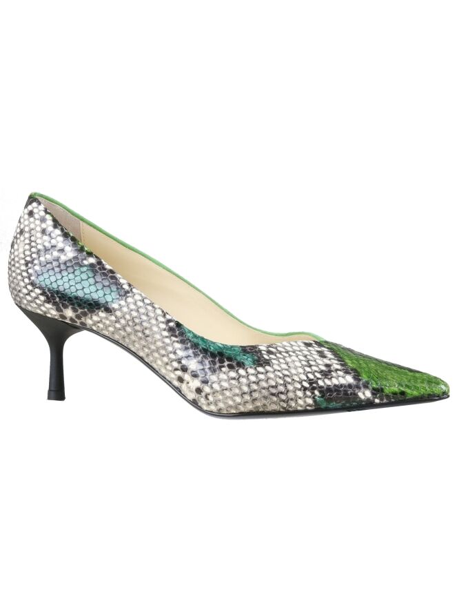 A pump from Fabi whose exterior and forefoot are in a reptile print with the colors creamy white, green and black, and the inside in a camoscio suede. The pump has a pointed toe and a queeny heel in the color black. The inside is lined with leather.