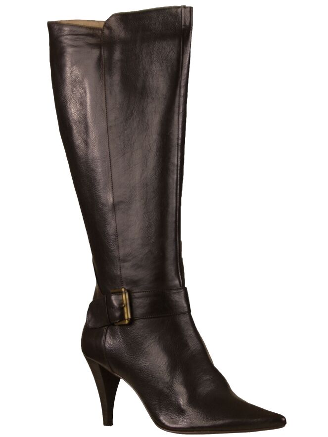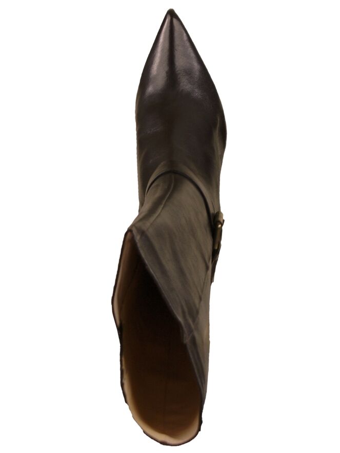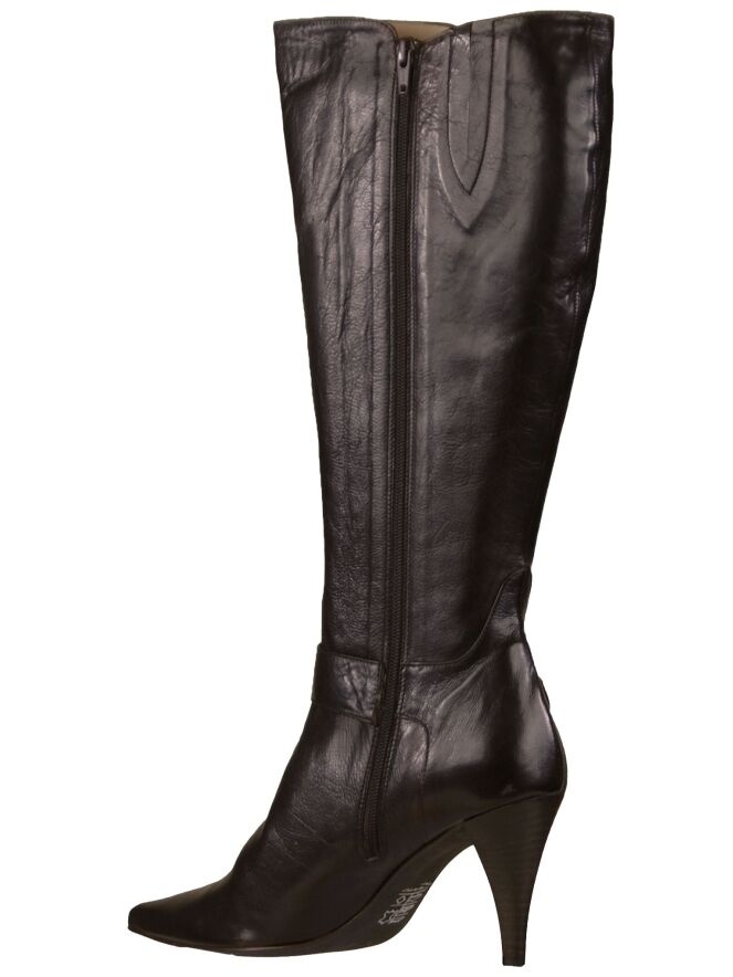 A high boot with a pointed toe of the brand Franco Troise in a Mocha brown color. At the bottom of the shaft is a band with a brass clasp. At the edge of the shaft is an incision with a hidden elastic piece. On the inside is the entire length of the shaft a zipper. The height of the shaft is 39 cm and the circumference is 41 cm.