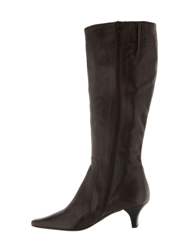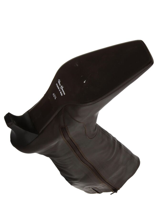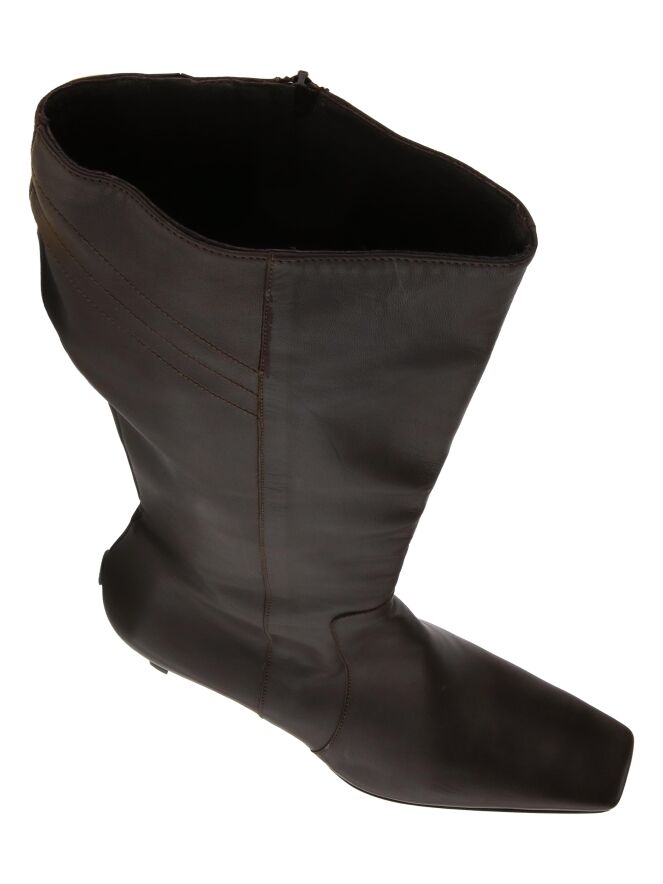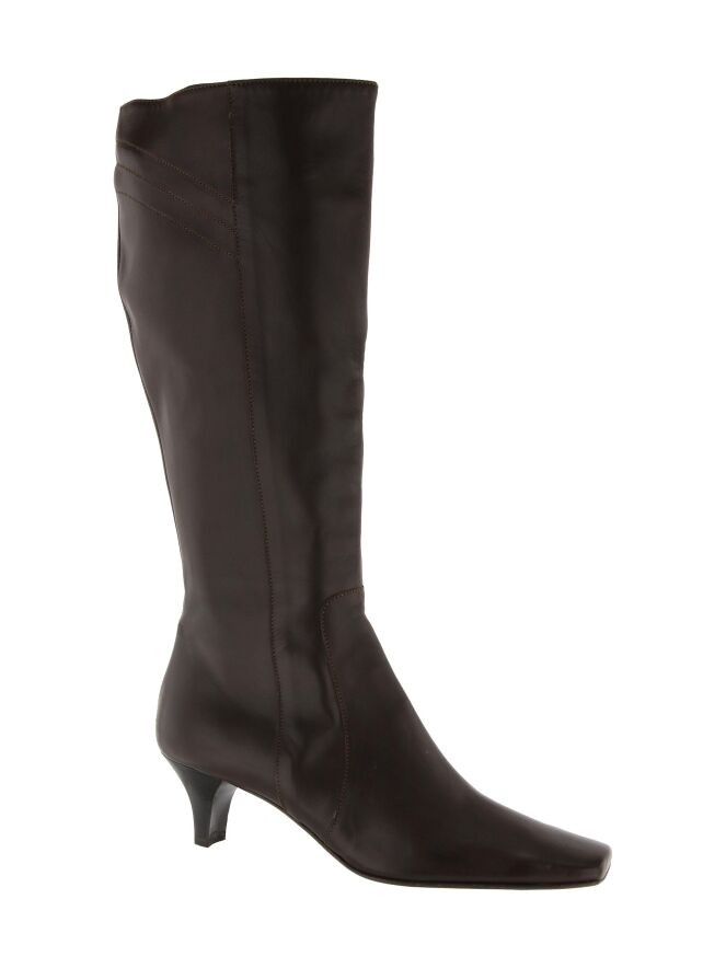 A high boot from the brand Franco Troise in a mocha brown color. The boot has a square toe and a slim heel. At the upper end of the shaft is a notch with a hidden elastic piece deployed. On the inner side is a zipper deployed from the sole to the upper side of the boot.