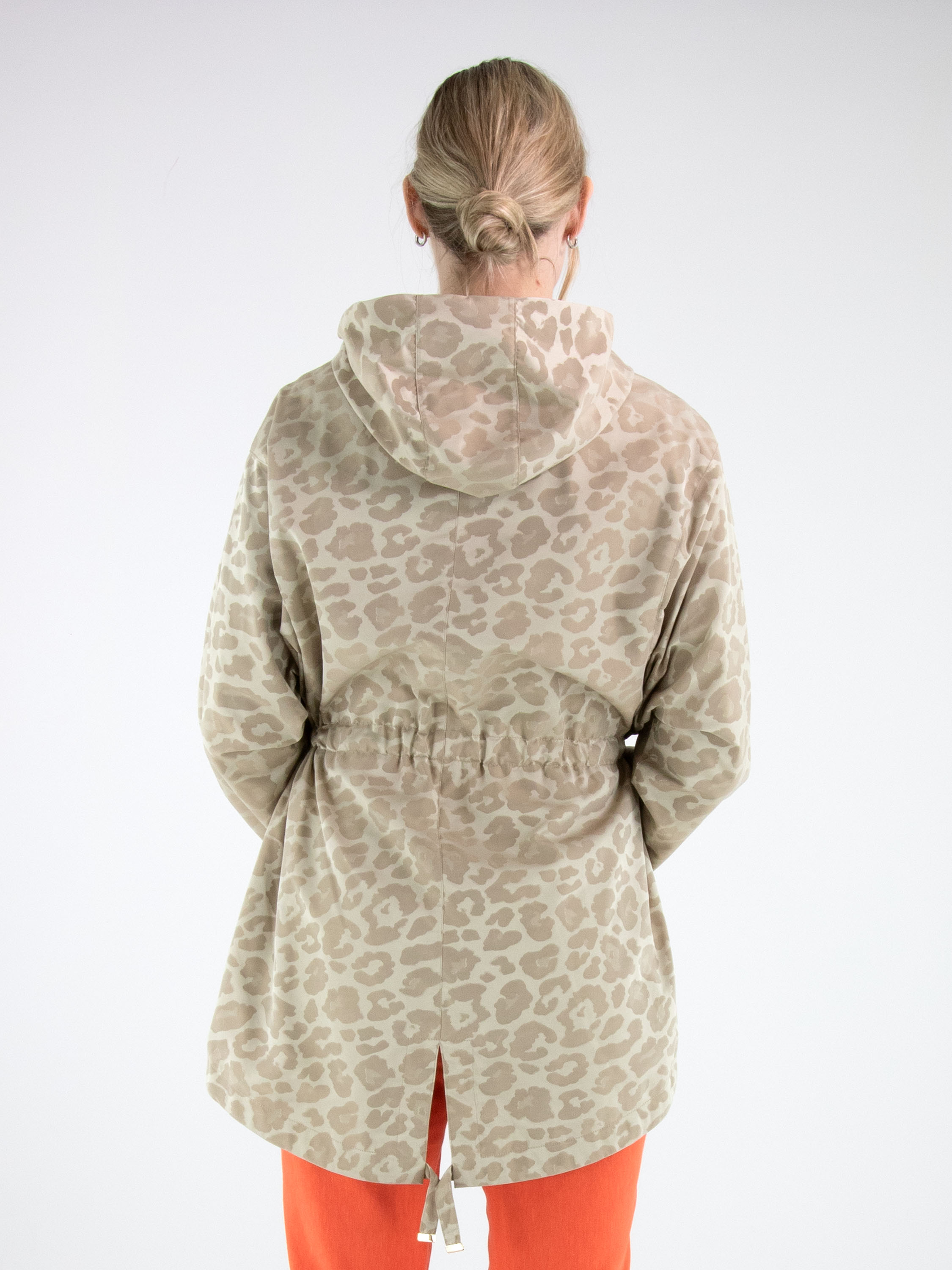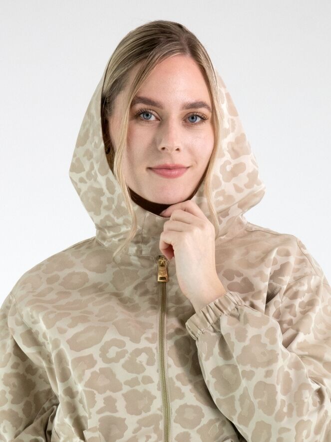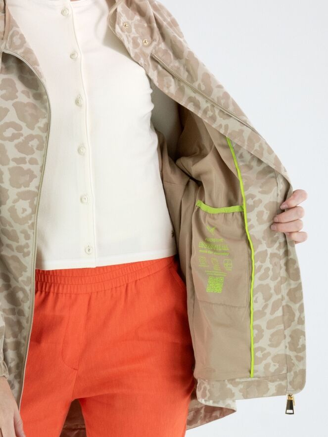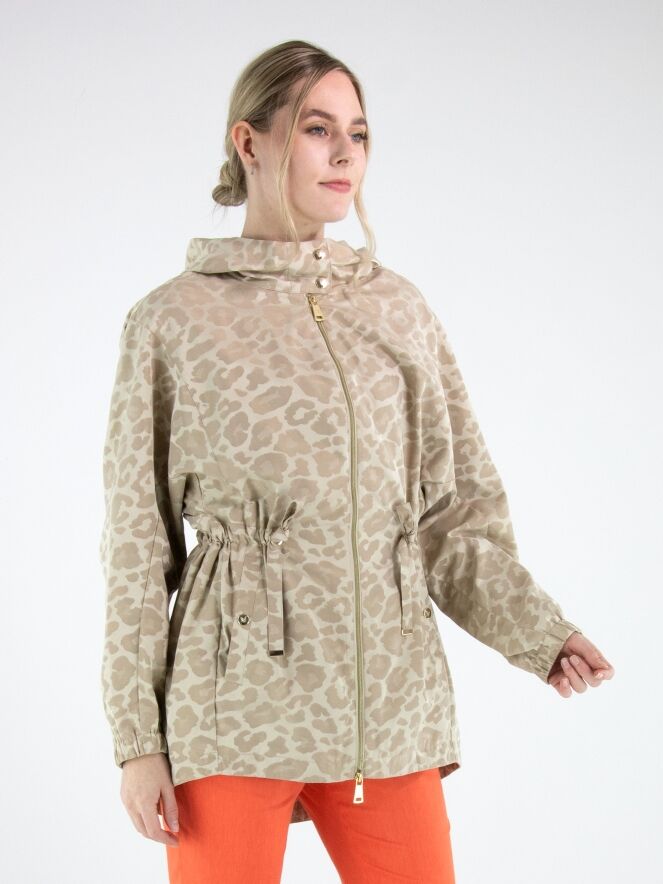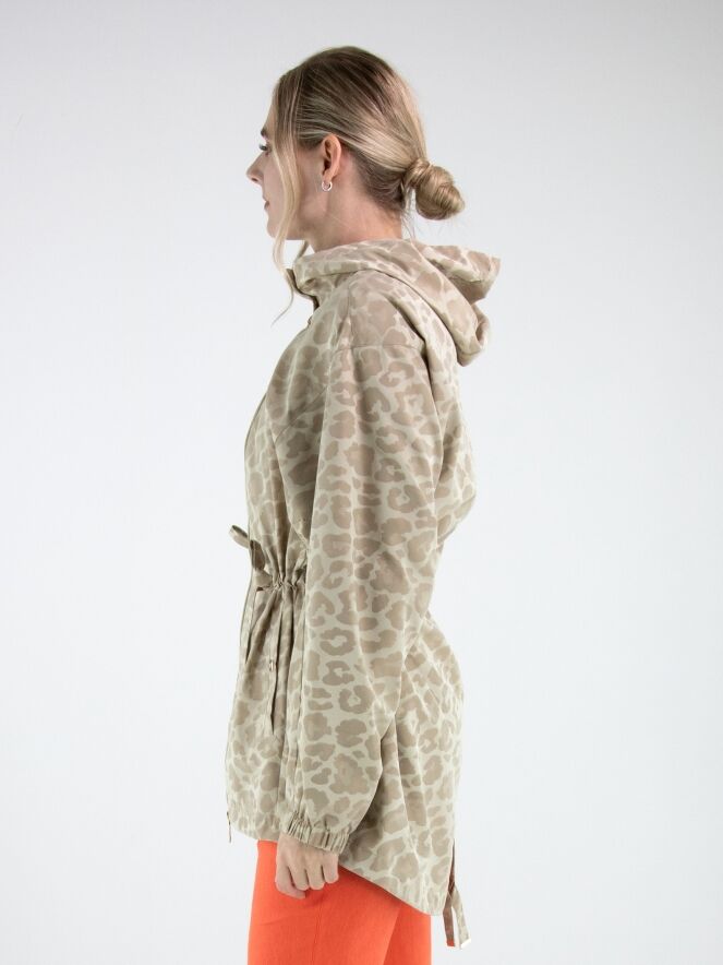 Parka by Fuchs Schmitt featuring a tone-on-tone leopard print in multiple shades of sand and beige. Designed with a hood and a gold-tone zip fastening, it offers a refined yet contemporary look. At the waist, a drawstring tunnel detail allows for a subtle pleated effect and adjustable shaping. Side pockets are positioned below the drawstring, while the long sleeves are finished with elastic cuffs. This exclusive parka coat can be washed at 30 degrees.