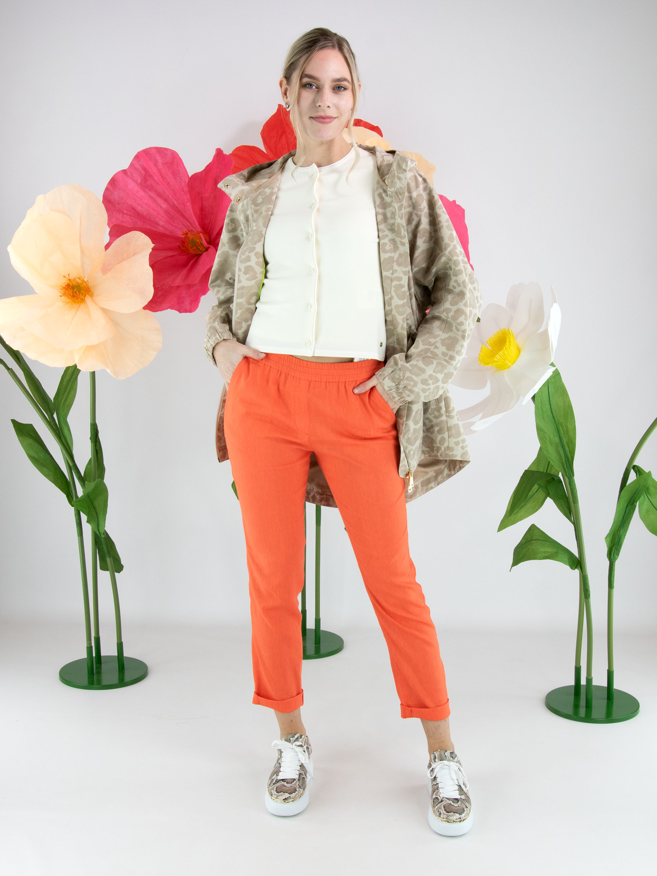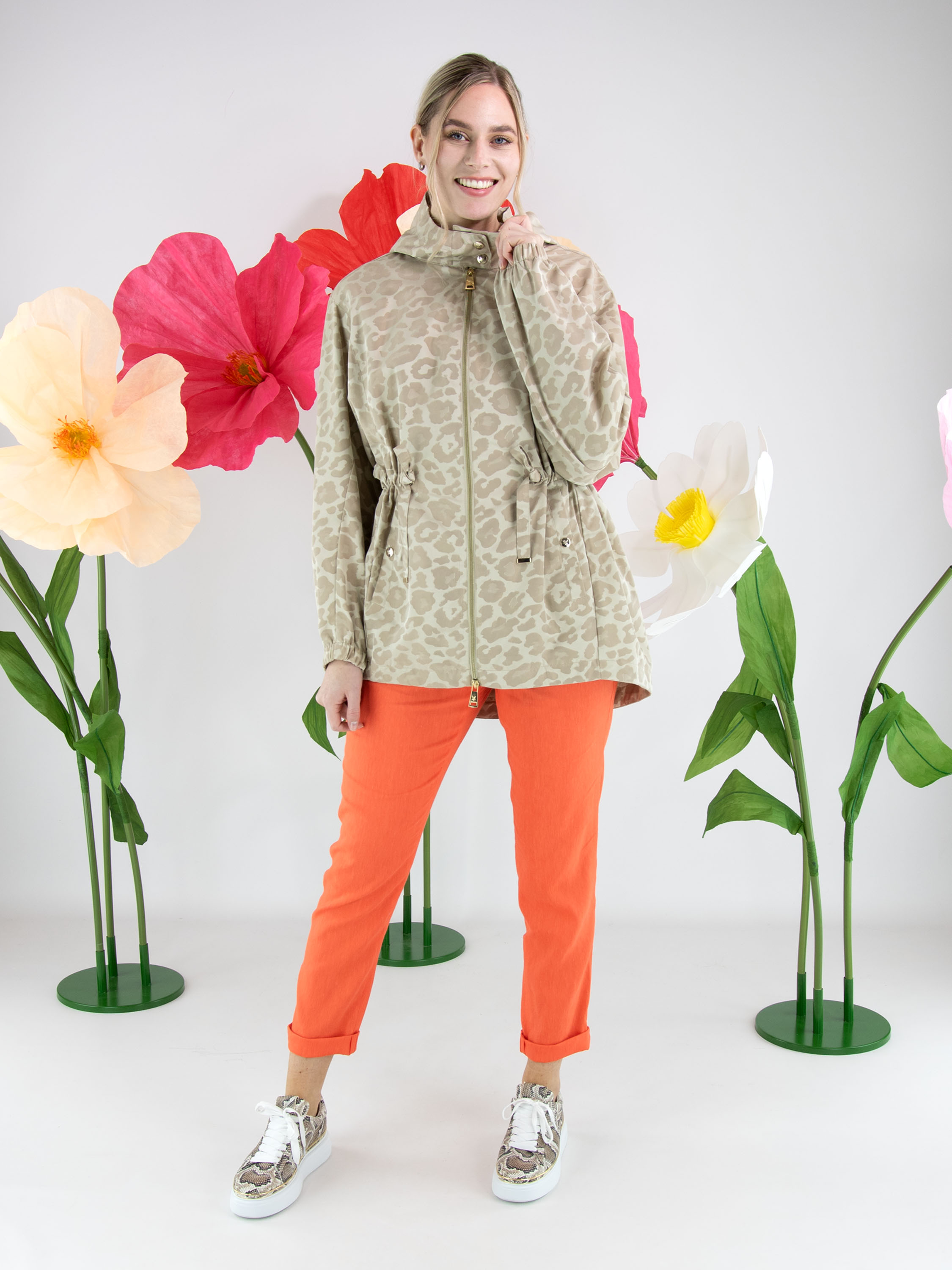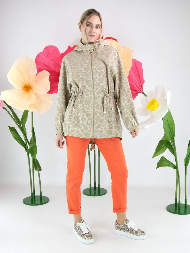 Parka by Fuchs Schmitt featuring a tone-on-tone leopard print in multiple shades of sand and beige. Designed with a hood and a gold-tone zip fastening, it offers a refined yet contemporary look. At the waist, a drawstring tunnel detail allows for a subtle pleated effect and adjustable shaping. Side pockets are positioned below the drawstring, while the long sleeves are finished with elastic cuffs. This exclusive parka coat can be washed at 30 degrees.