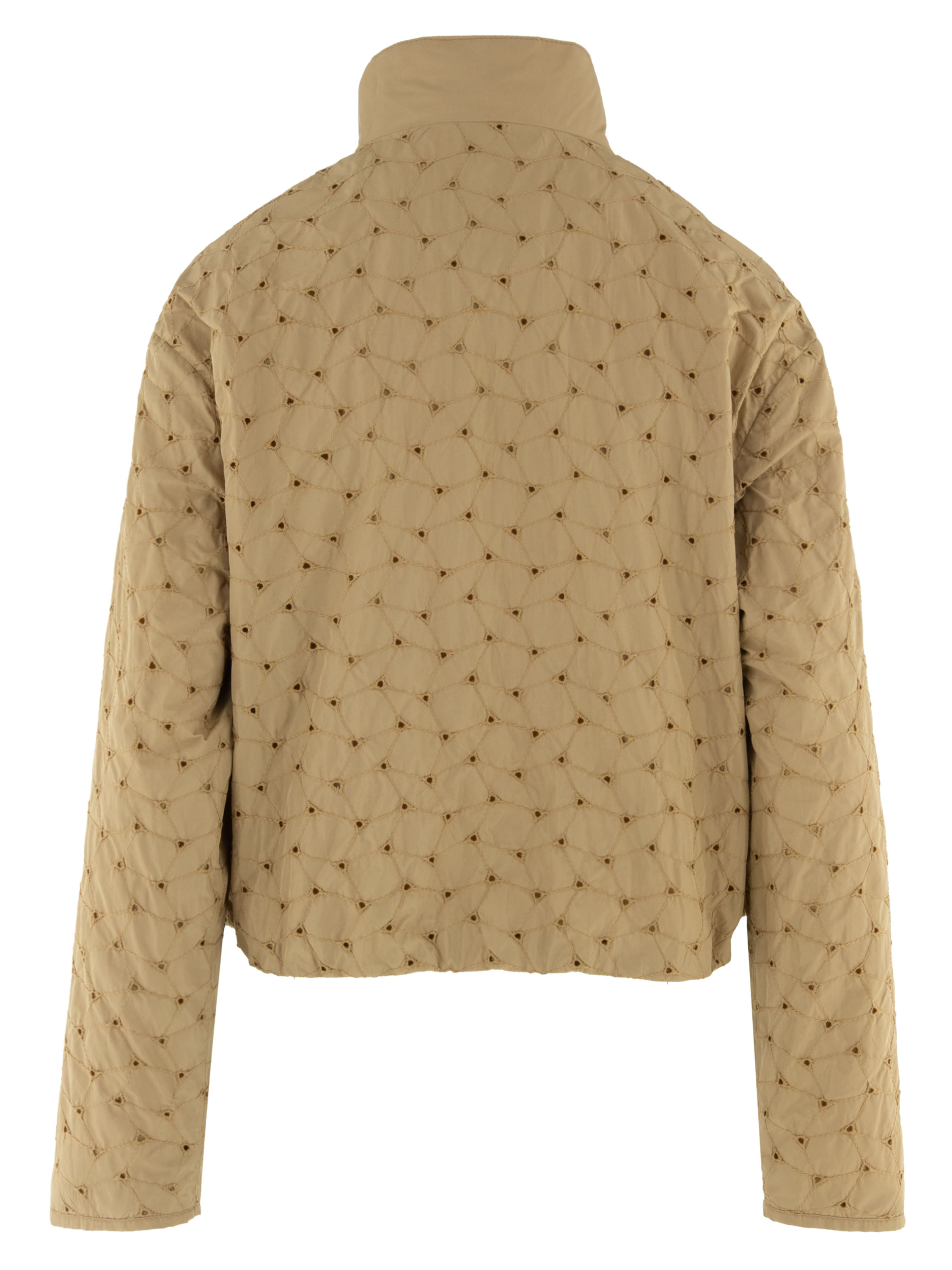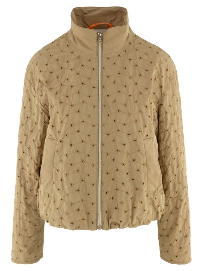 Summer coat by Fuchs Schmitt in a warm camel shade. The fabric features decorative stitching in a subtle diamond pattern and is perforated at the intersections of the seams, creating an airy and refined effect. The coat is designed with a silver-tone zip fastening and practical side pockets. This exclusive women’s coat can be washed at 30 degrees.