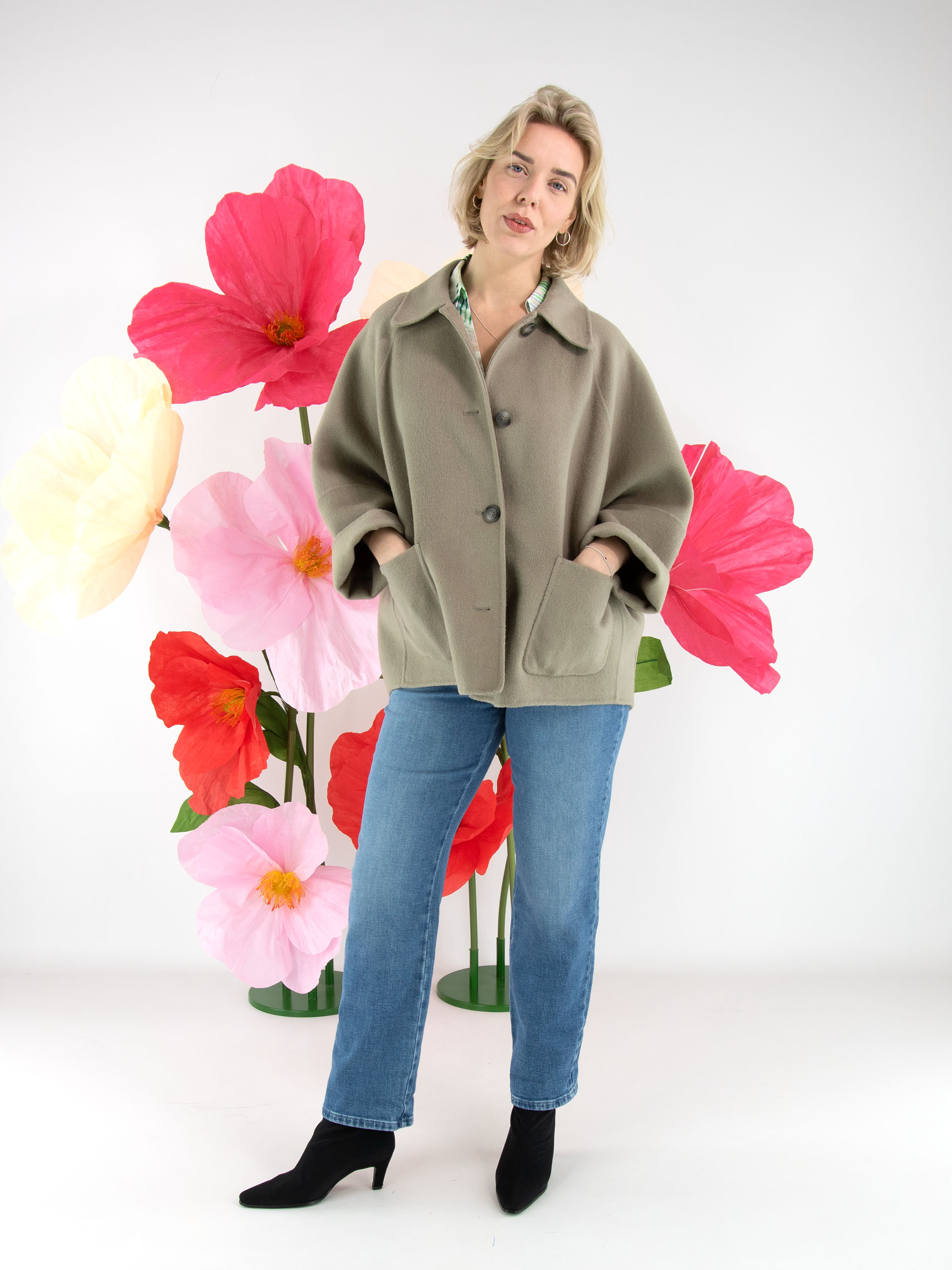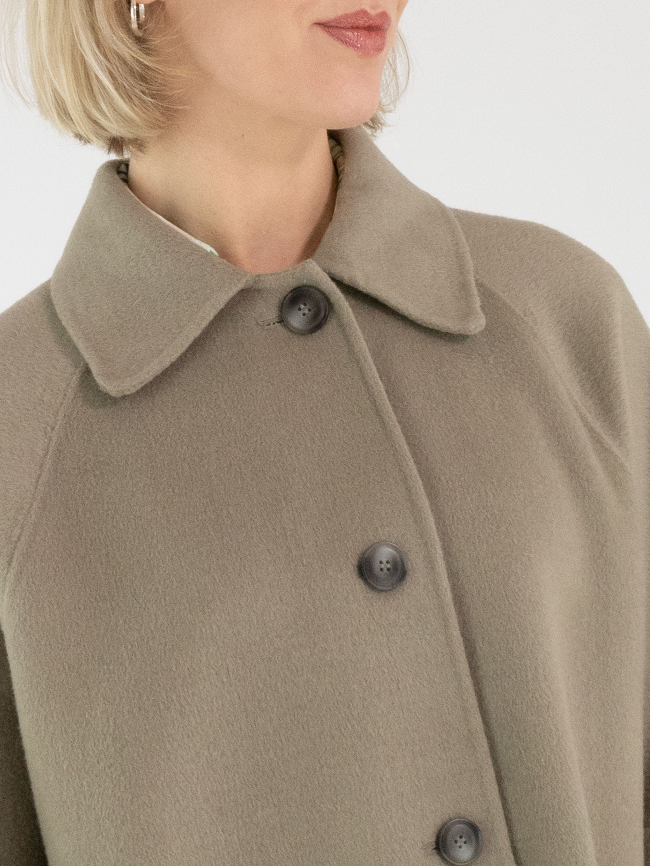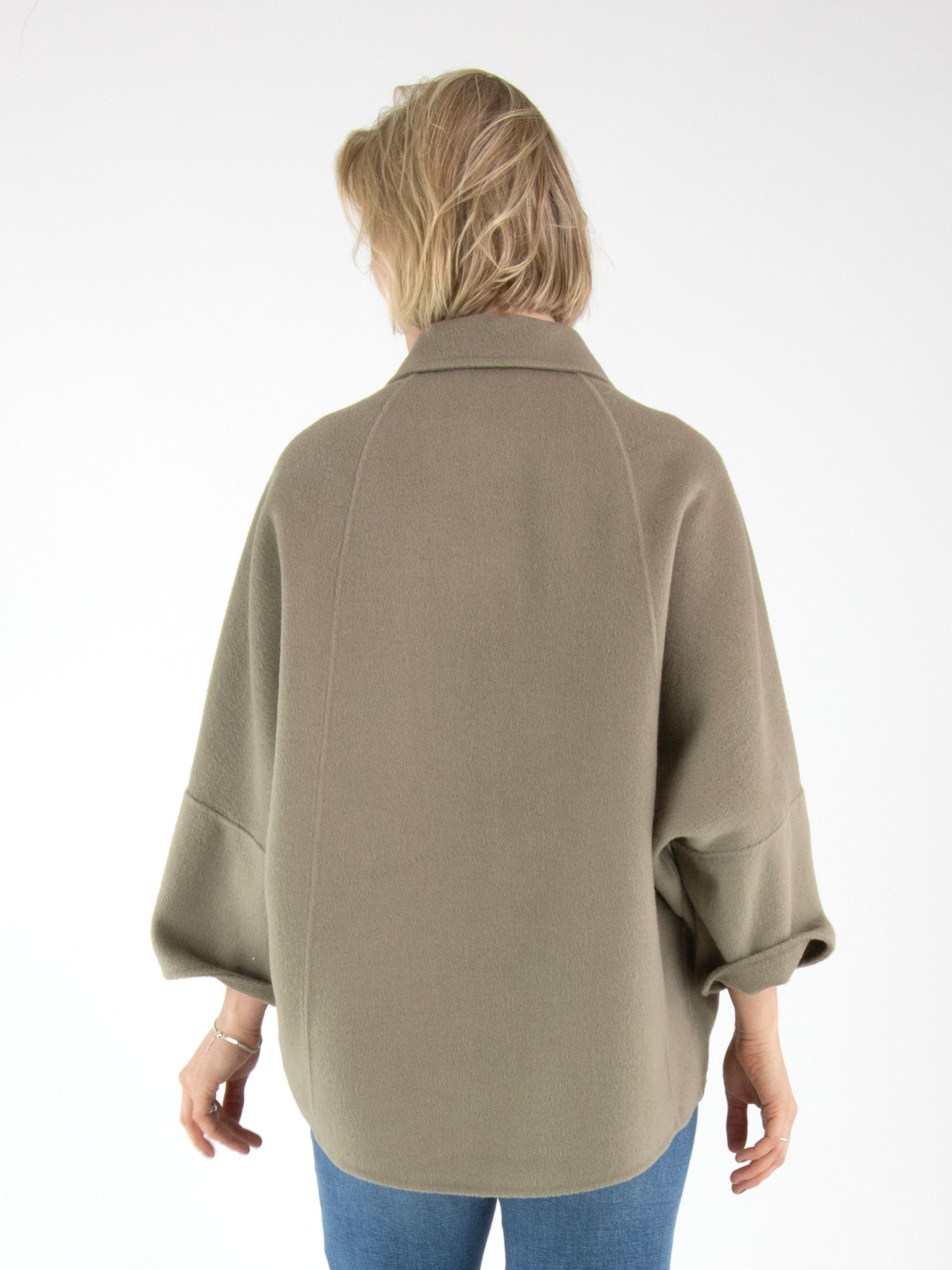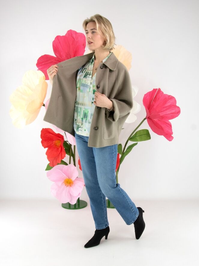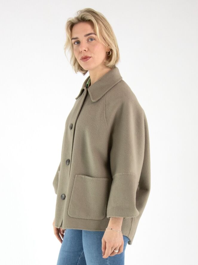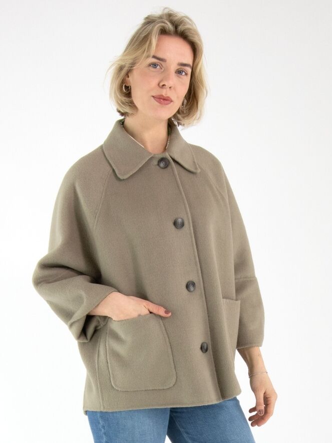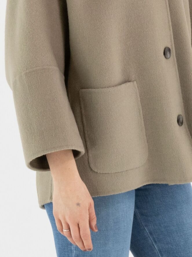 A coat by Fuchs Schmitt in a soft taupe shade. The coat features a four-button closure. It is unlined, designed with half-length batwing sleeves, and must not be washed.