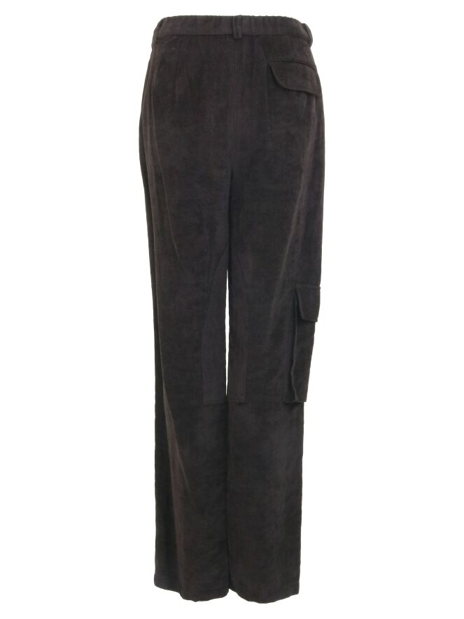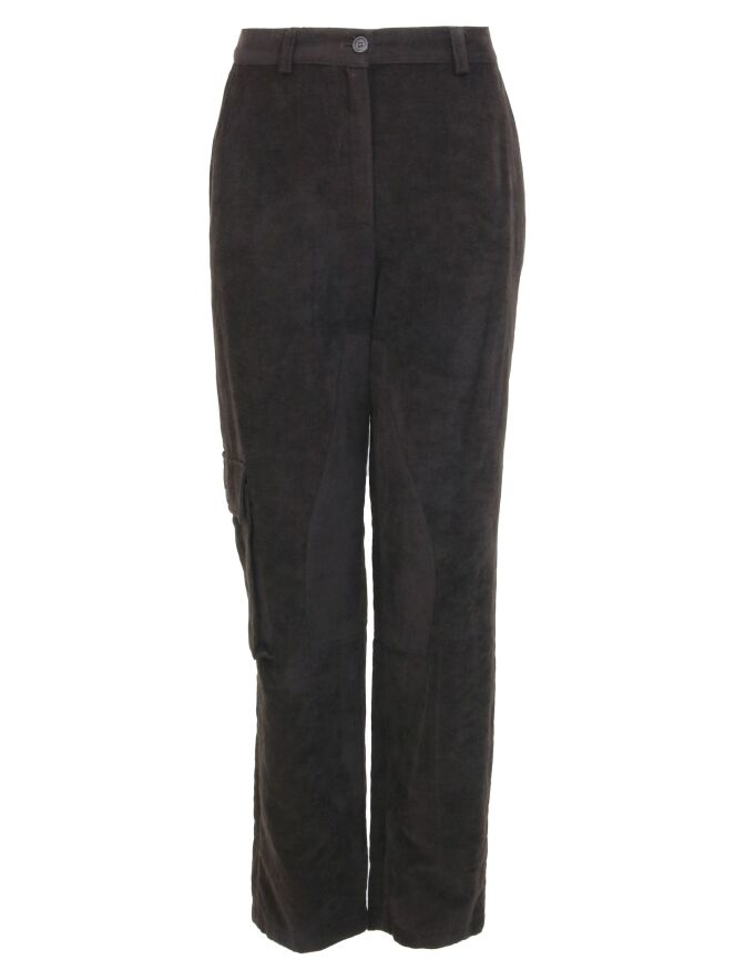 Velor cargo pants from Gabi lauton in the color mocha brown. The pants have side pockets and can be washed by hand.