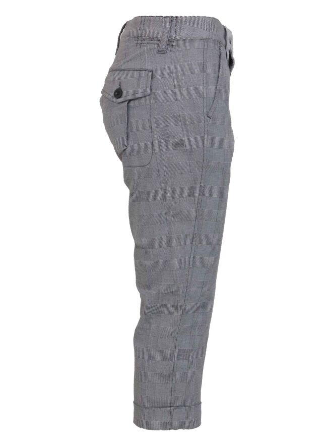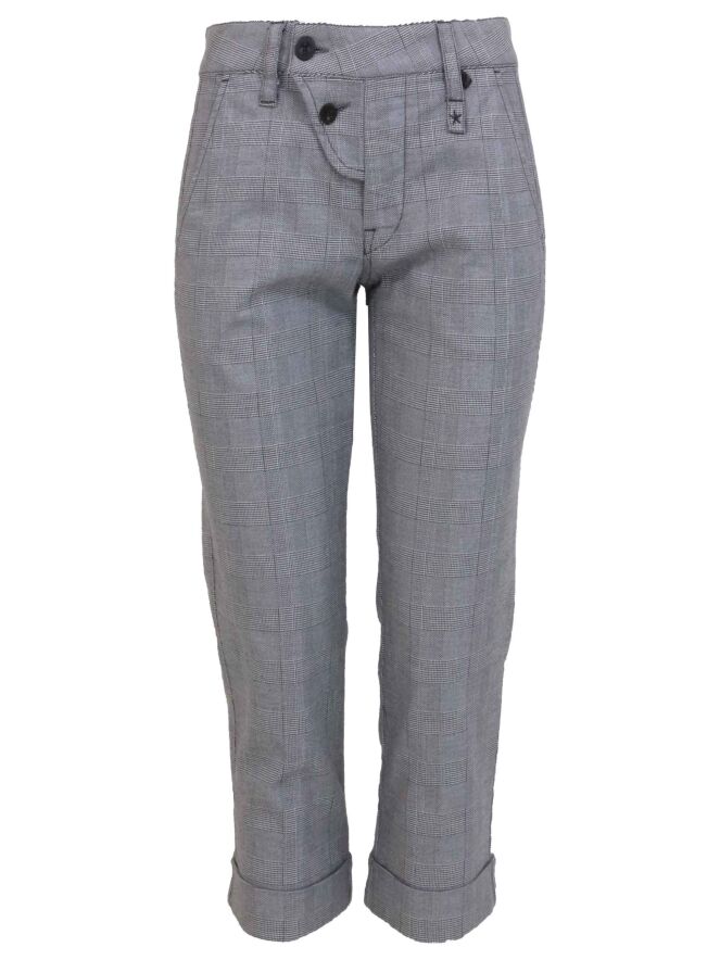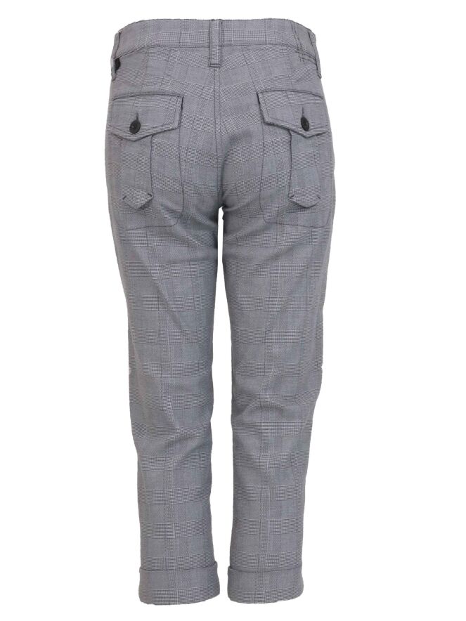A capri from Girbaud in a prince de Galles pattern with the colors black and white. The capri has side pockets and a short cover at the bottom of the legs. This capri can be washed by hand.