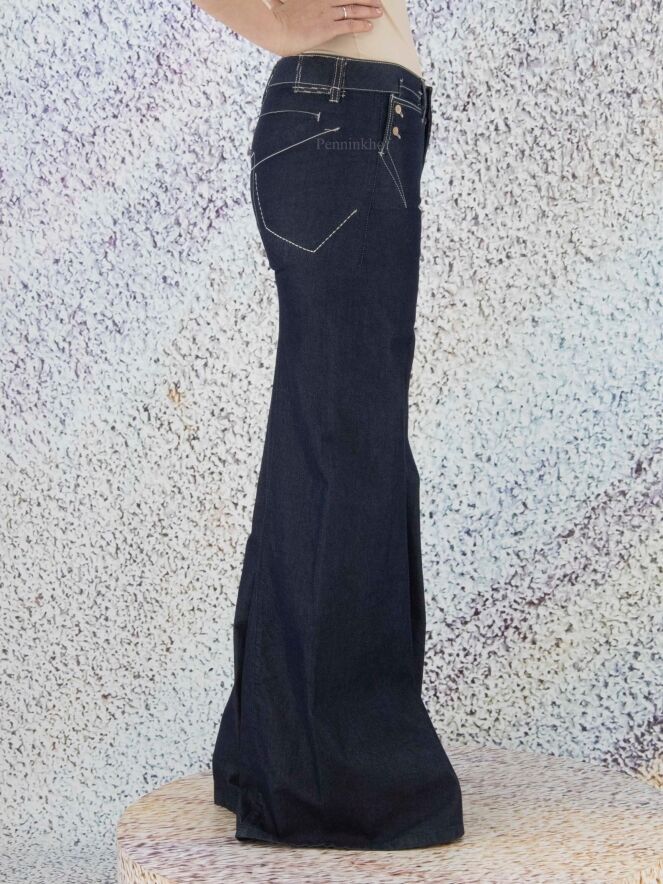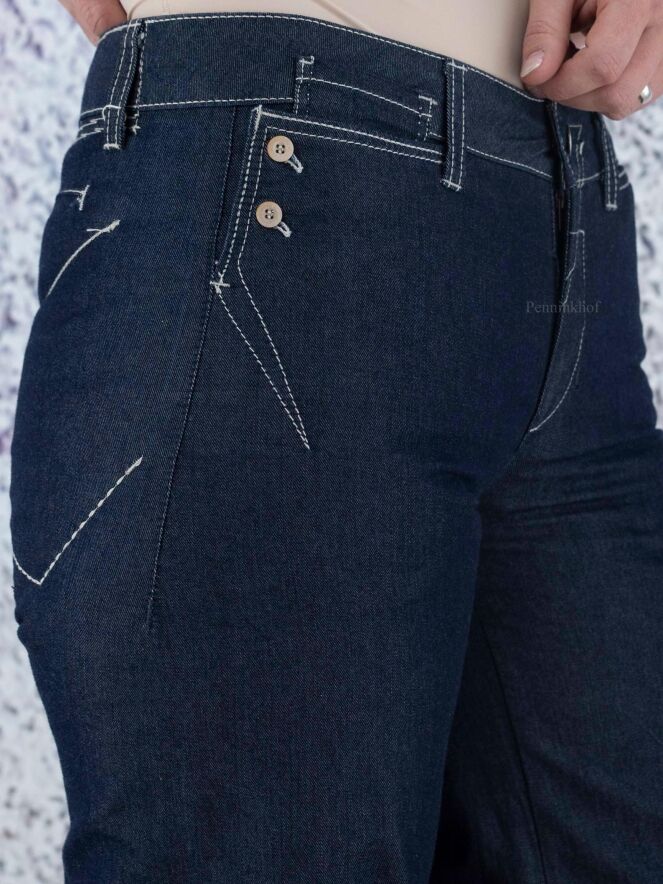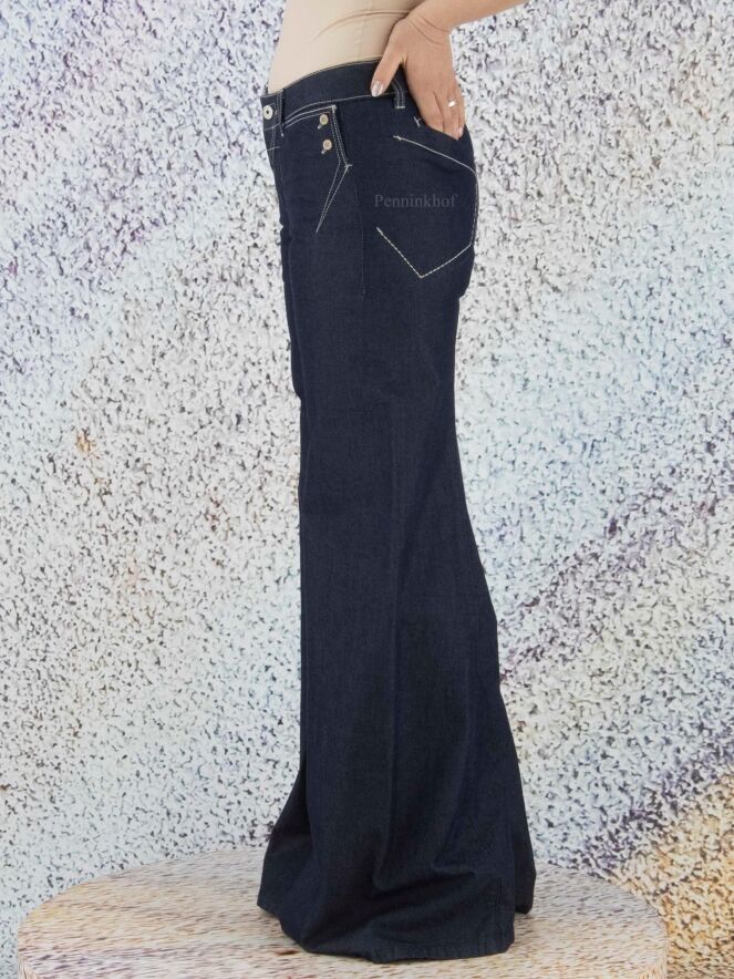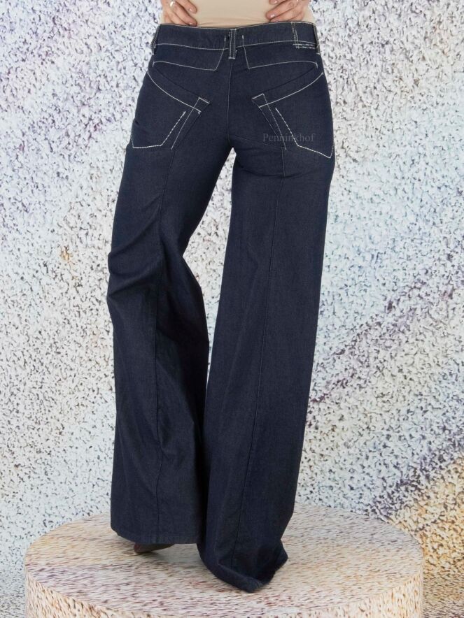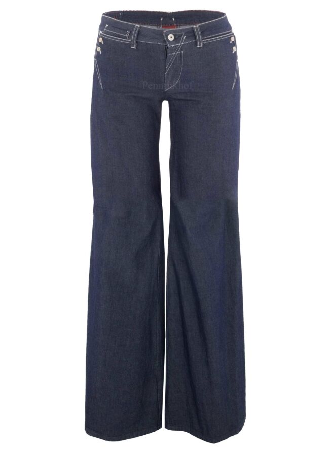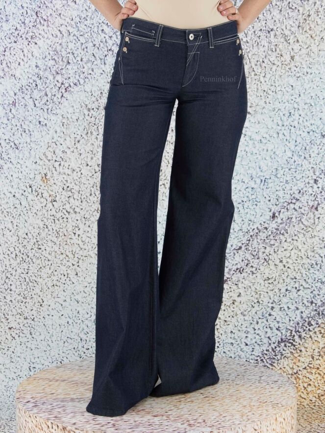 A pair of jeans from Girbaud in the color jeans blue. The jeans is in a wide flare model. At the back the diagonal pockets have coarse stitching in a rope color. These jeans can be washed at 30 degrees.