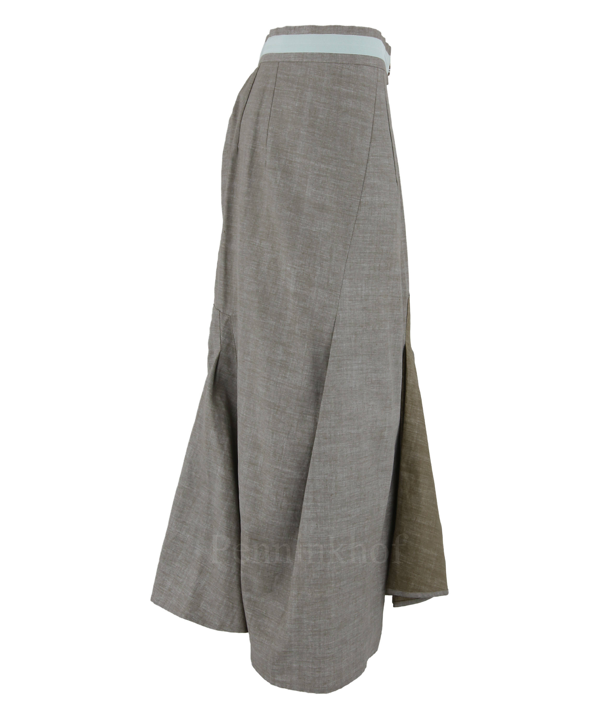 A long skirt by Heide Ost in a mixed gray color. At the waist is a decorative ice blue trim with a multi color button. From the top of the knee are some pleats. This skirt can be washed at 30 degrees.