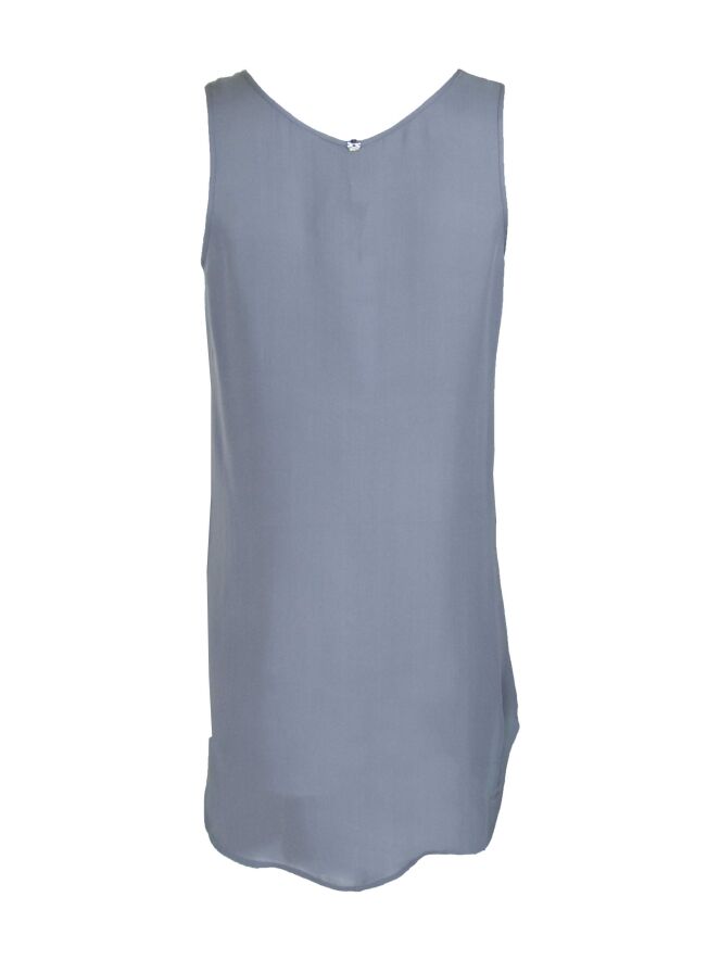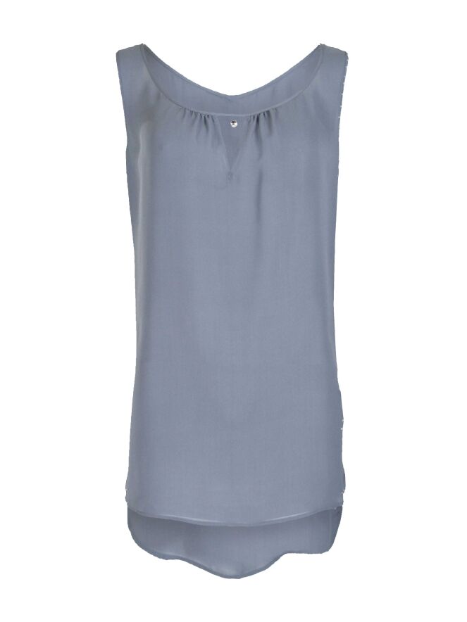 A top of the brand High in a grey color. The top is transparent and has a deep-cut round neckline which has some folds in the middle. This top may be hand washed.