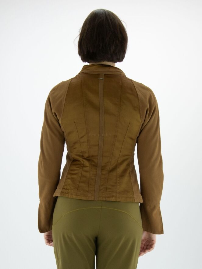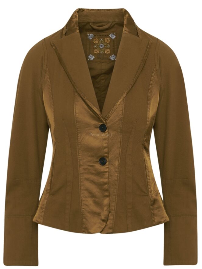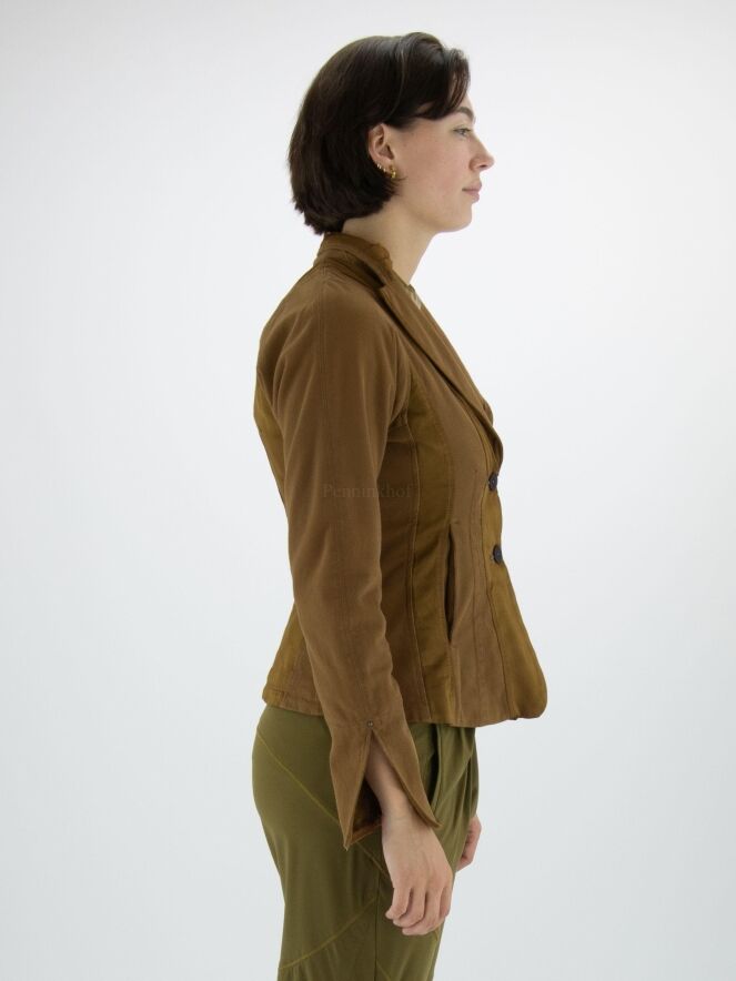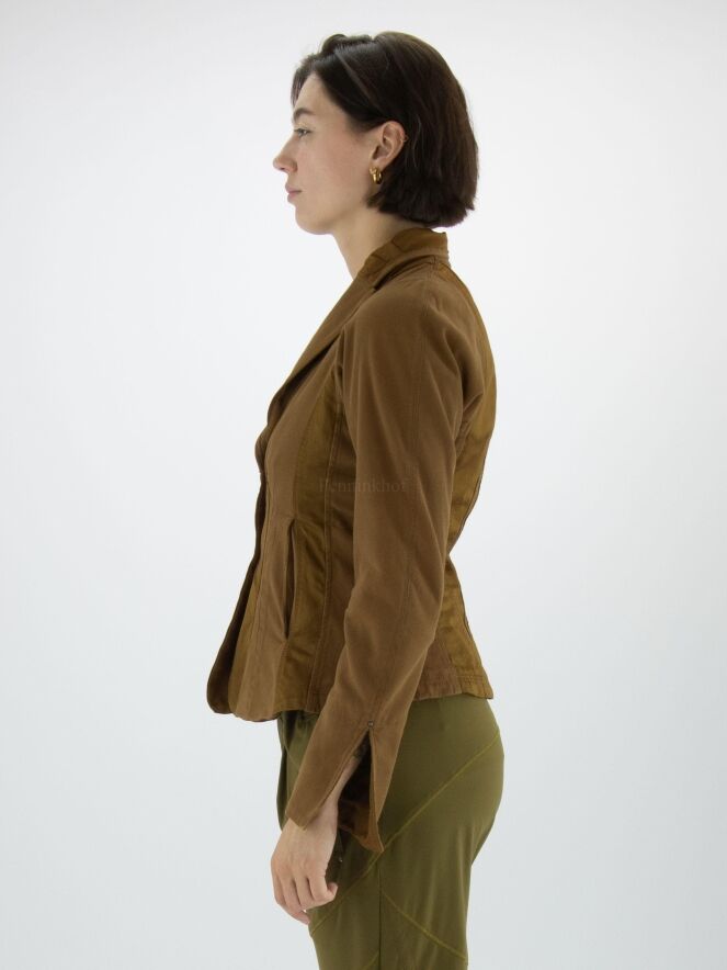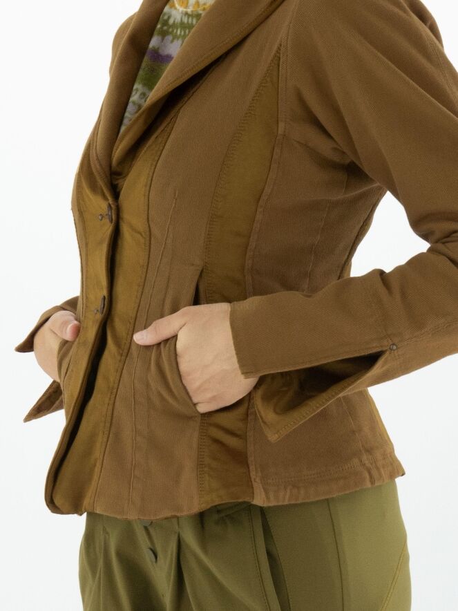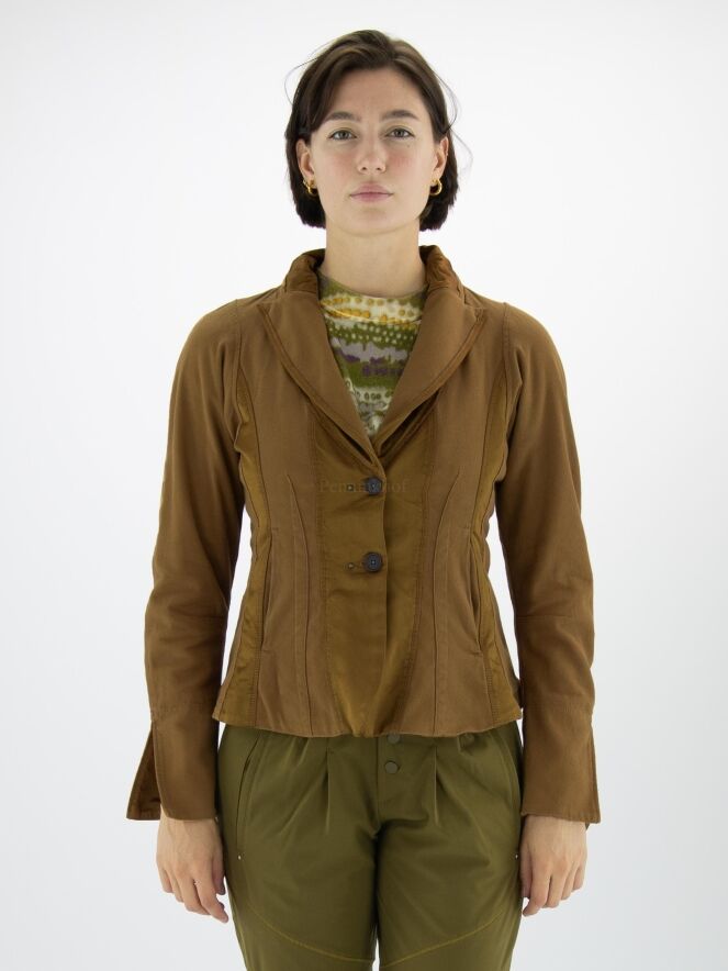 A blazer from High in a camel colour. The blazer is in a rib cord fabric. The collar and back is in a matt satin fabric. This fabric is reflected at the front in 2 wide piping with a wide hem on both sides of the button closure. There are slit pockets at waist level. This blazer should not be washed.