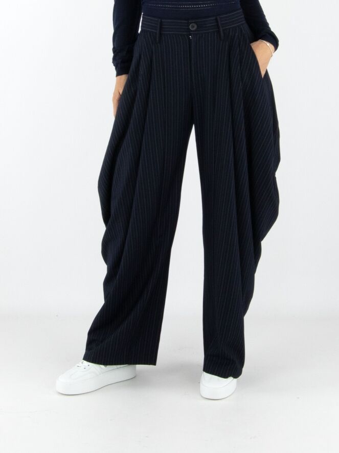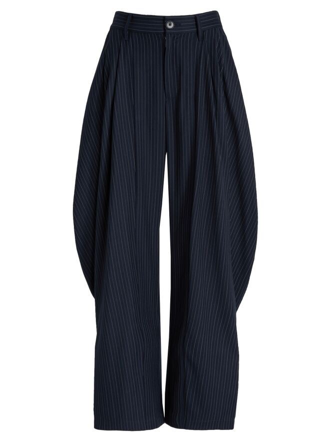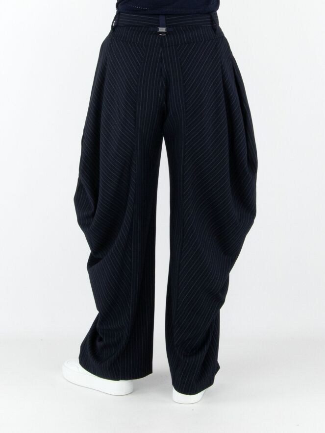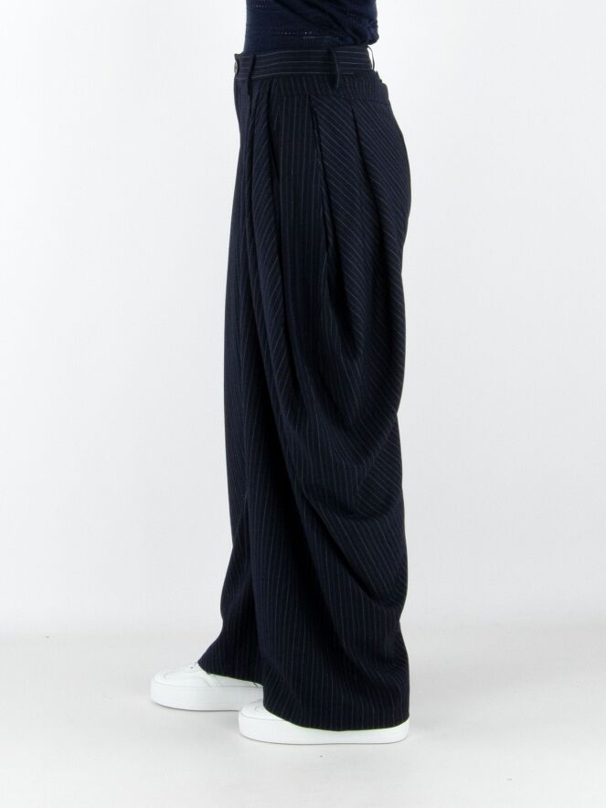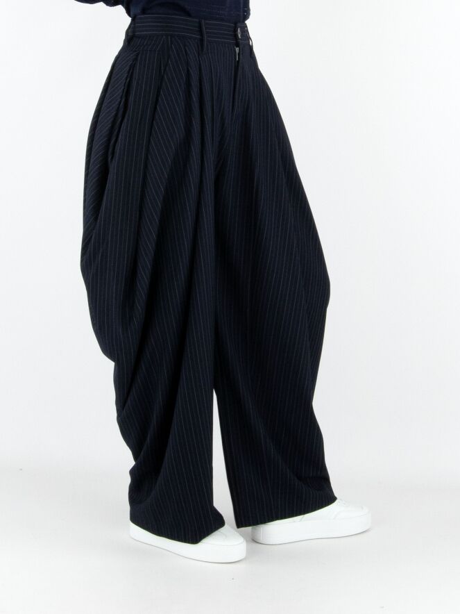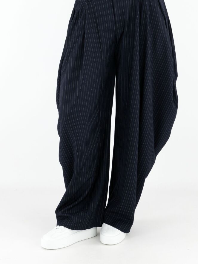 High trousers inspired by equestrian style, designed in a navy pinstripe pattern with blue and off-white stripes. Multiple pleats start from the waistband, with extra wide pleats at the sides that enhance the balloon effect. The trousers feature side pockets and should be hand washed.