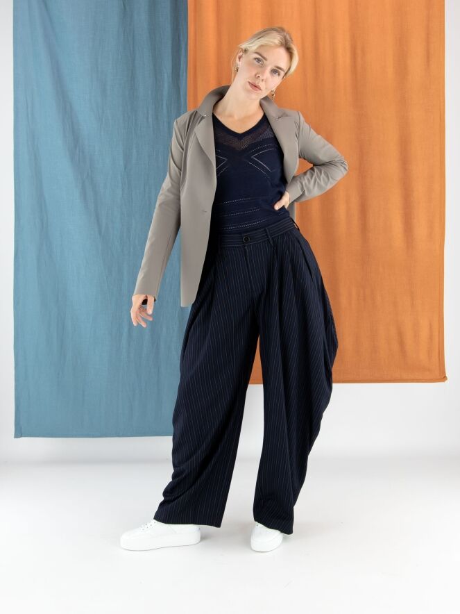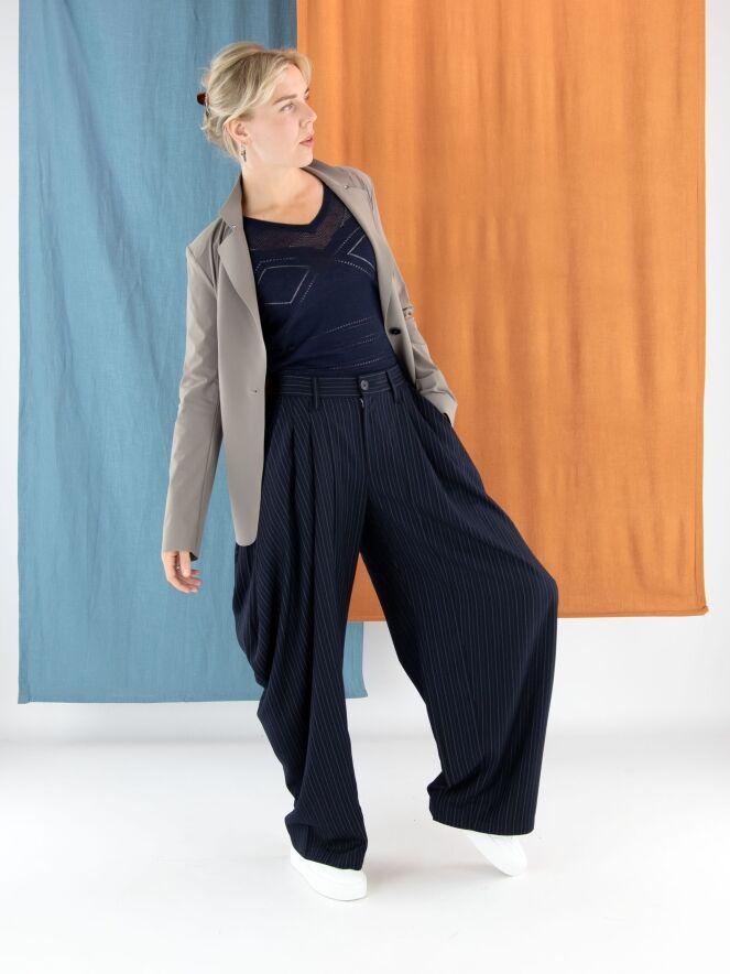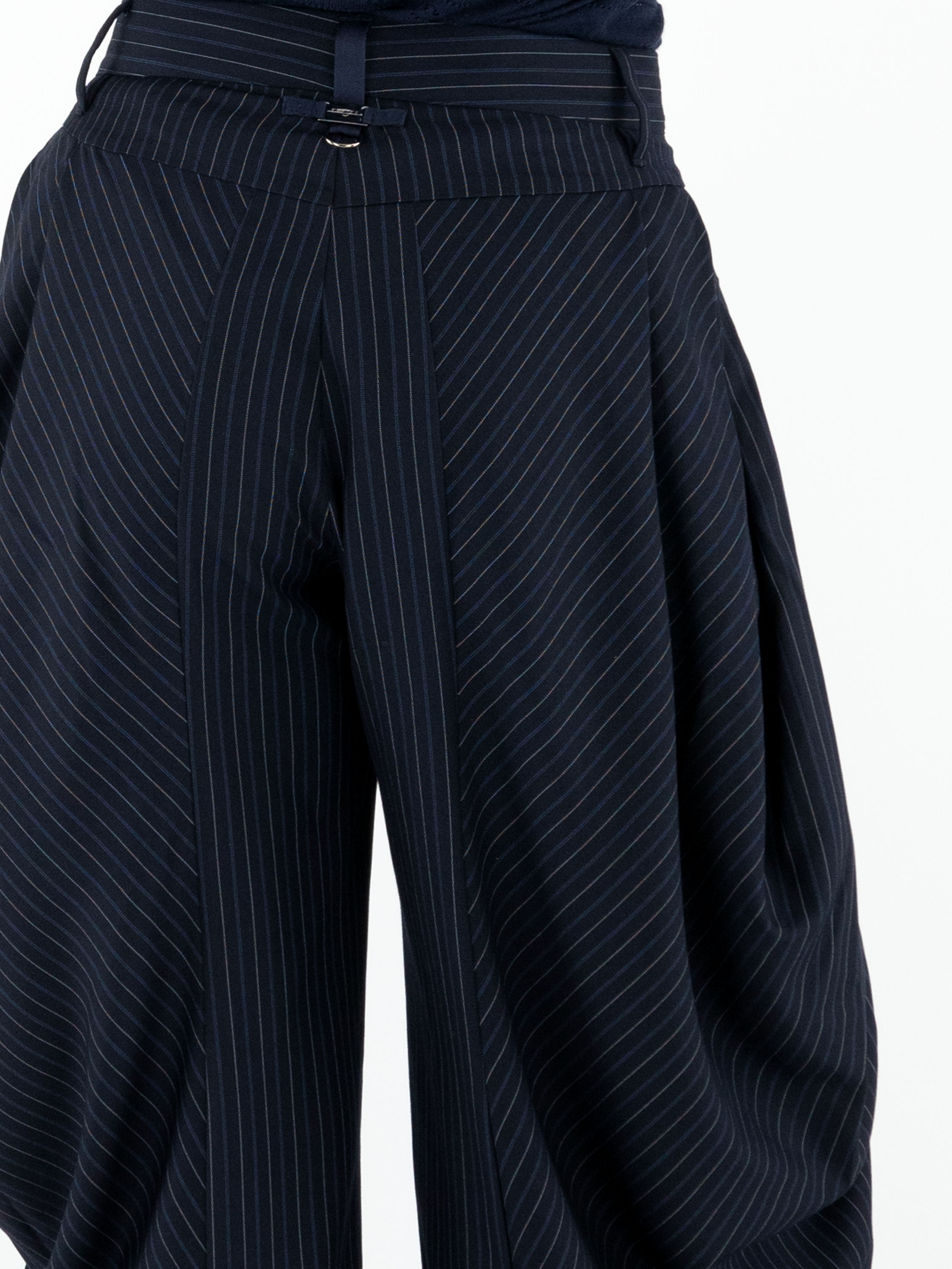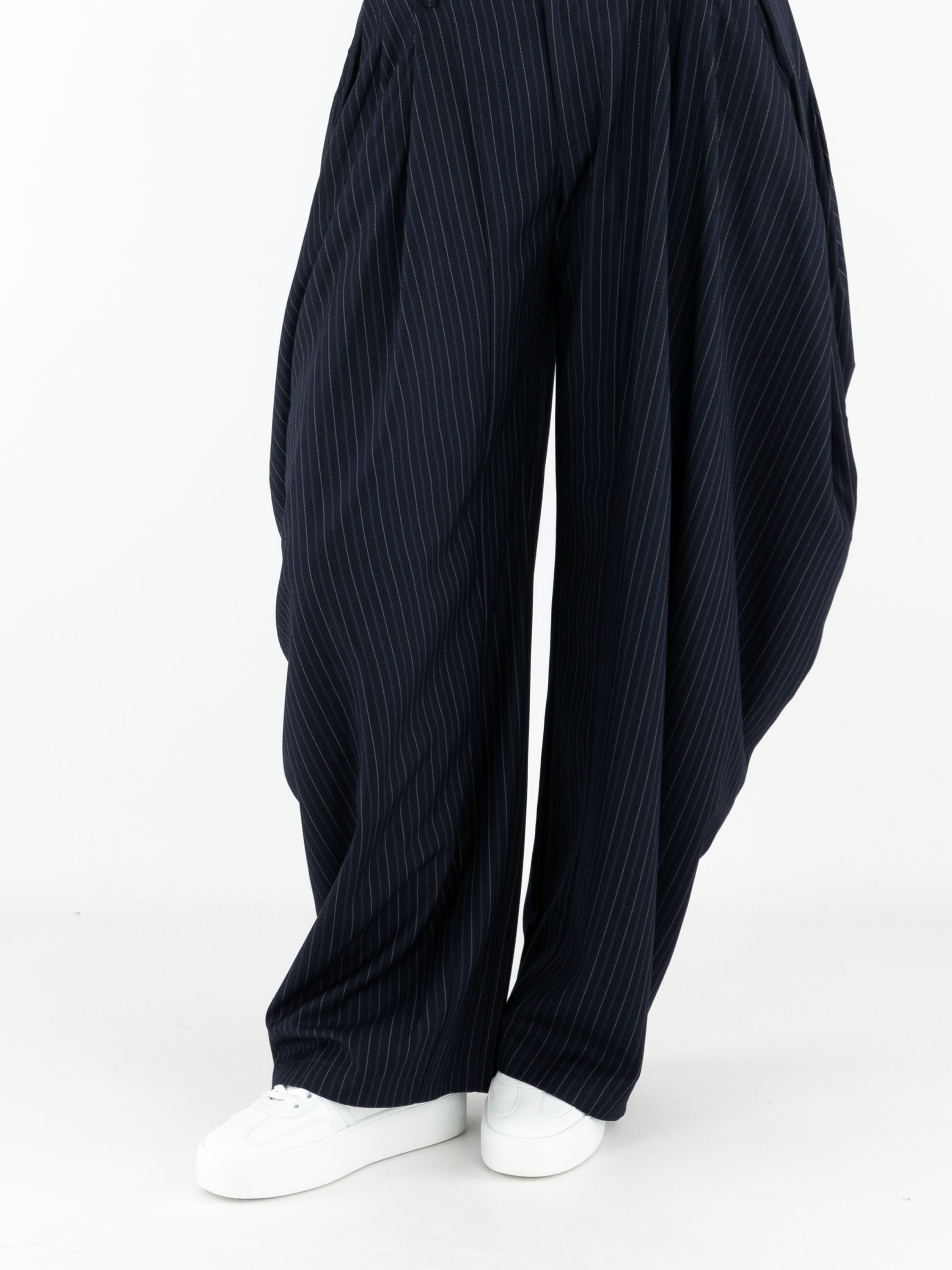 High trousers inspired by equestrian style, designed in a navy pinstripe pattern with blue and off-white stripes. Multiple pleats start from the waistband, with extra wide pleats at the sides that enhance the balloon effect. The trousers feature side pockets and should be hand washed.