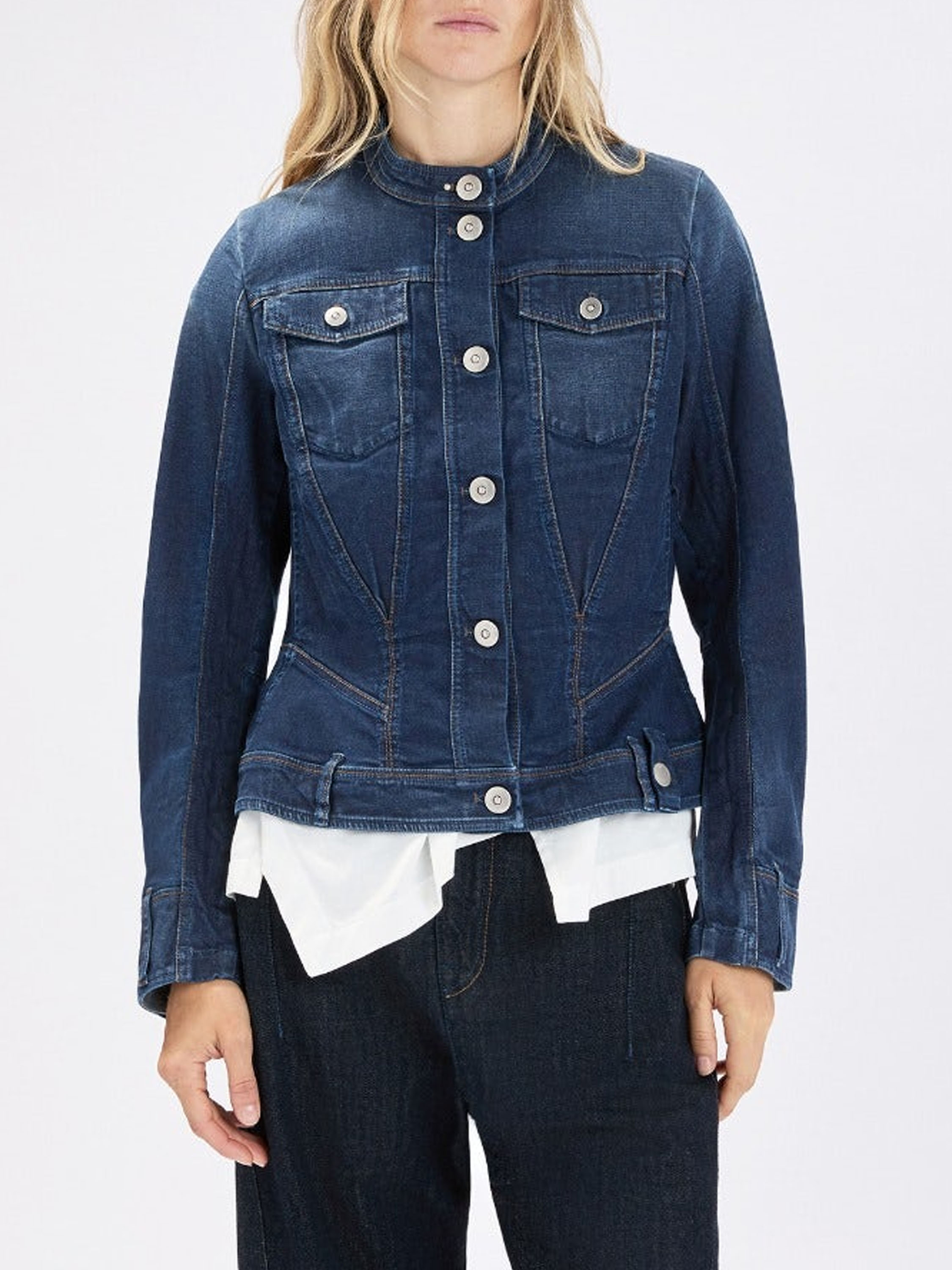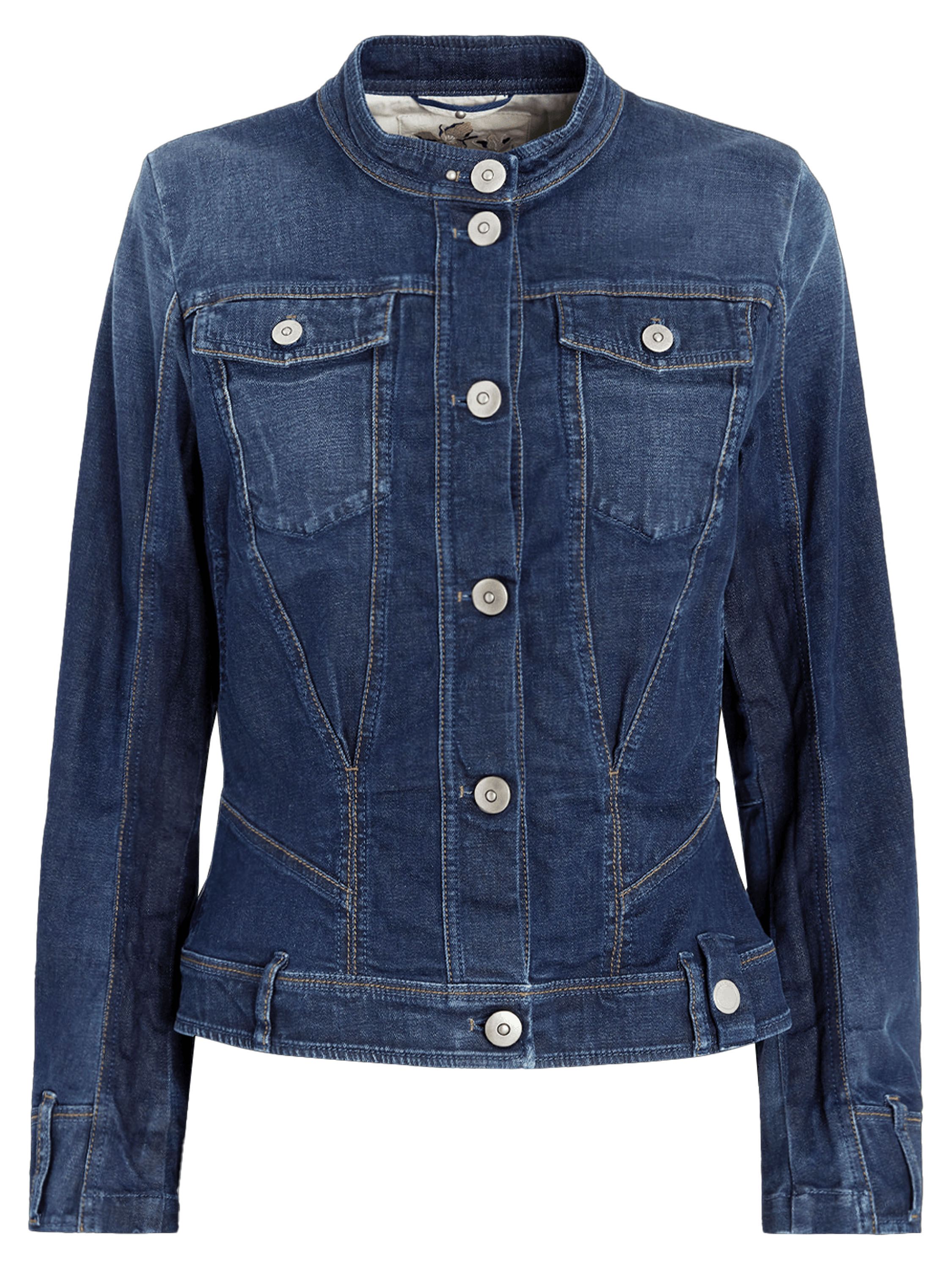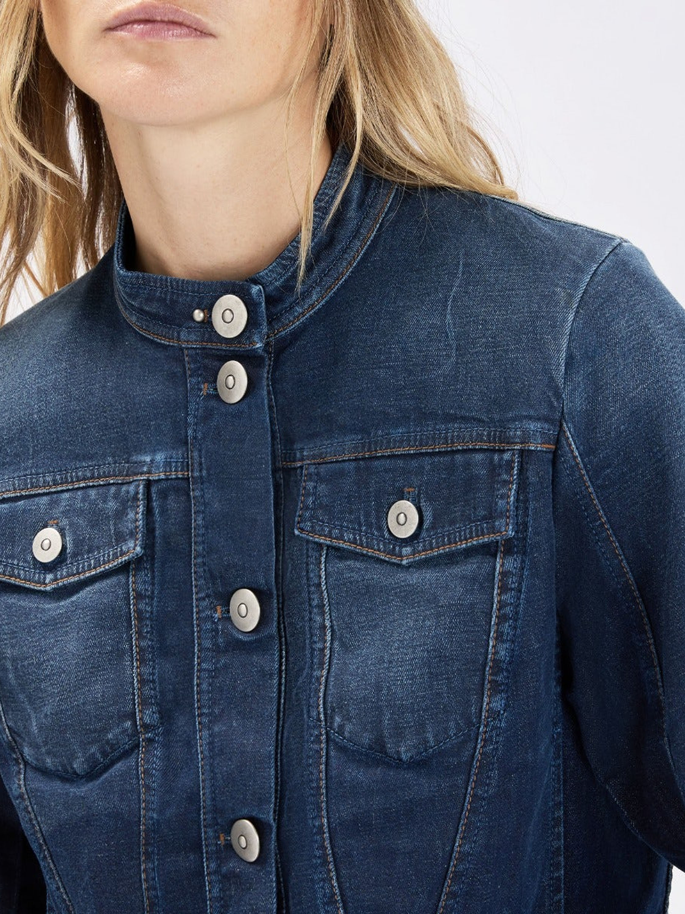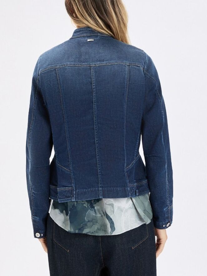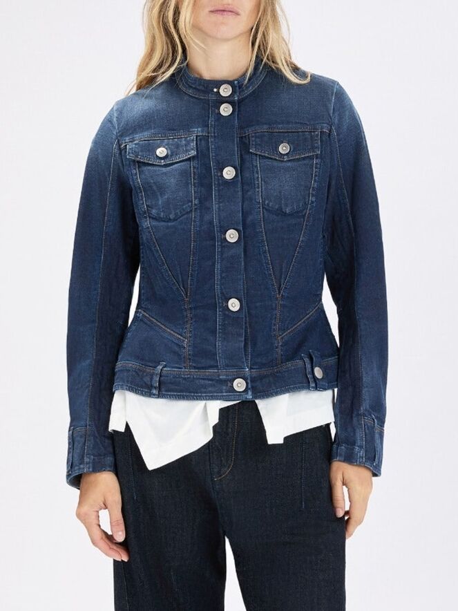 Denim blazer by High in a rich blue shade. The seams are finished in a contrasting cognac colour, adding a warm and refined detail. The blazer has a tailored fit and features side pockets at the waist. It fastens with six round metal-coloured buttons. This blazer can be washed at 30 degrees.